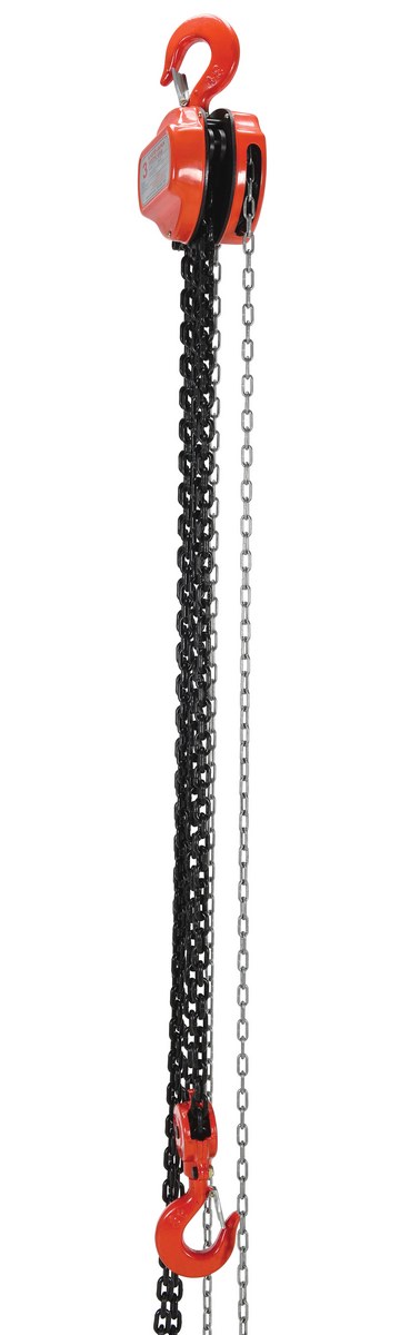Steel Manual Chain Hoist 20 Ft. Lift 6,000 Lb. Capacity OrangeThe hand chain hoists are ideal for industrial applications. The hoist is light weight, ergonomically friendly to handle, and designed for comfortable use in low headroom /confined areas or work. Features include a pull chain with upper and lower hooks constructed of forged steel for additional strength and hardened two stage gears for a quicker pulling time.