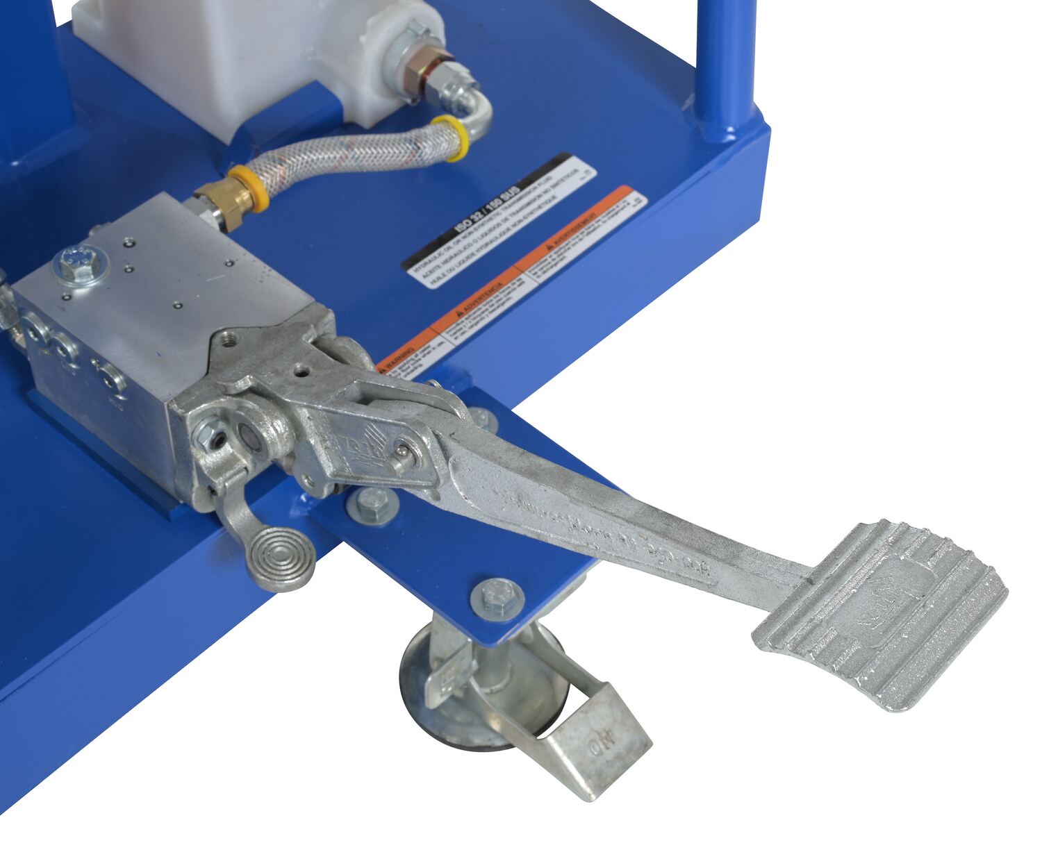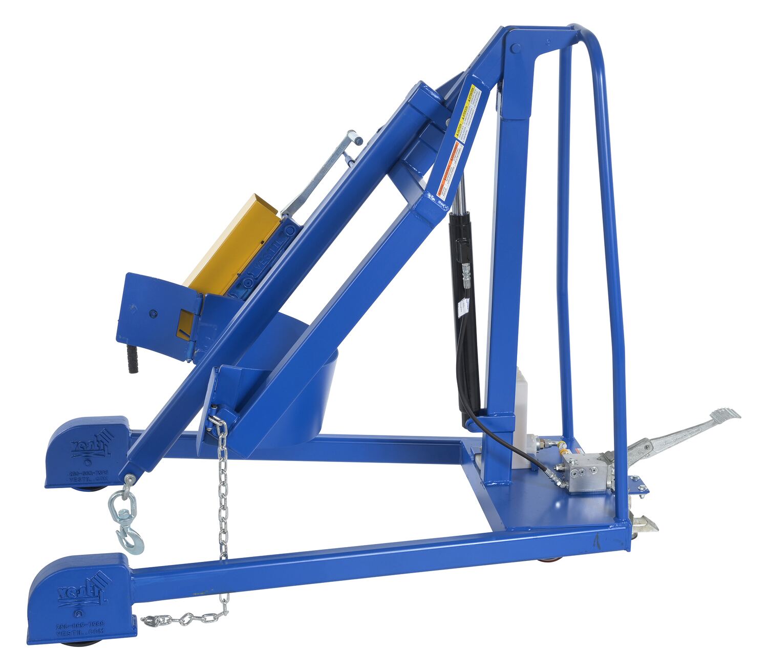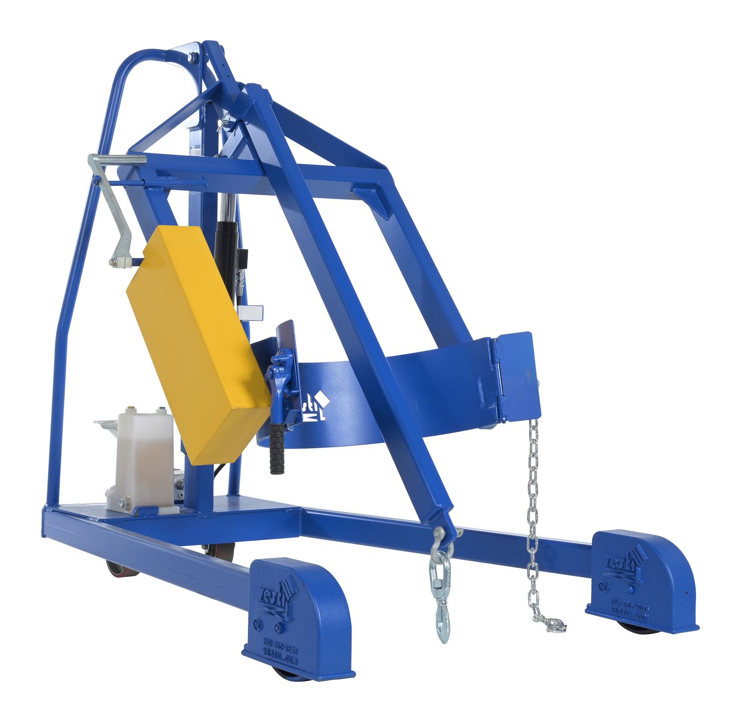 Steel Portable Hydraulic Drum Carrier, Rotator and Boom 71-1/4 In. Lift Height 800 Lb. Capacity Blue / YellowThe portable Hydraulic drum carrier/rotator/boom allows one person to lift, transport, and dispense fully loaded steel drums with ease. It features a manual foot pump hydraulic lift and rolls on casters and wheels. This unit has a chain rotation to rotate the drum. This unit features a lifting boom attachment which stores on the outriggers.