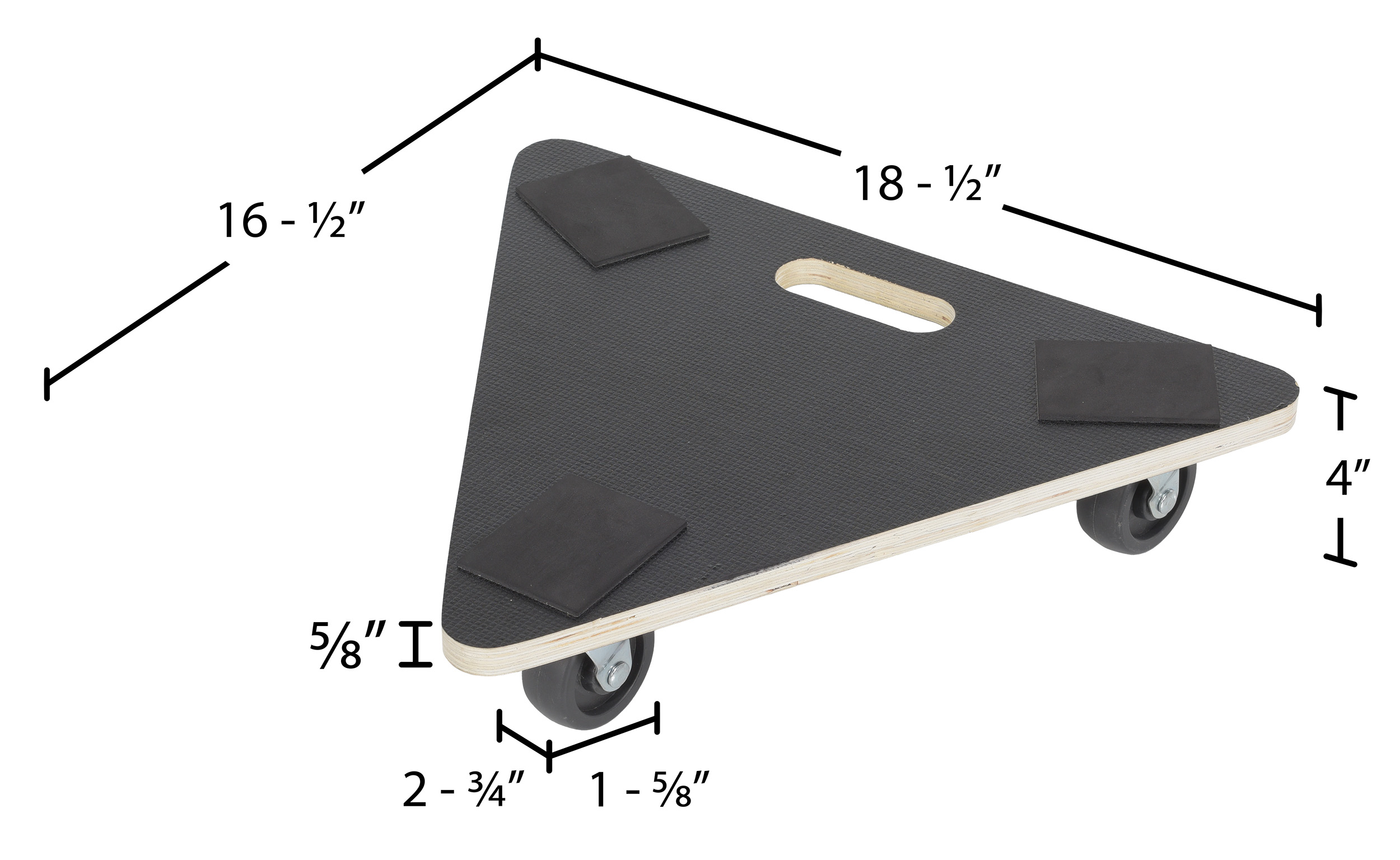Hardwood Triangle Dolly Deck 16-1/2 In. x 18-1/2 In. x 4 In. 300 Lb. Capacity BlackThe Hardwood dolly is ideal for the distributing and shipping facilities. The unit is designed to transports boxes, crates, or supplies from workstation to workstation. The dolly can be modified by placing a pull strap for ergonomically friendly use.