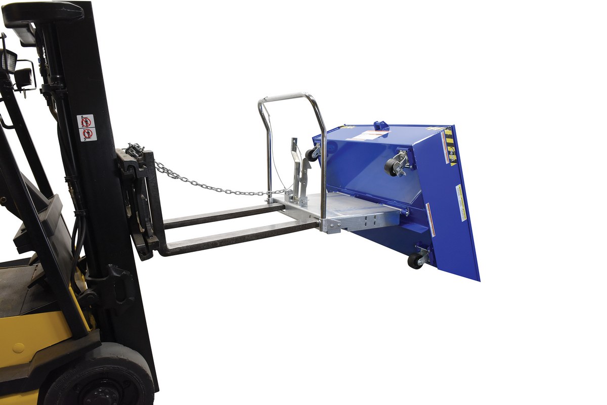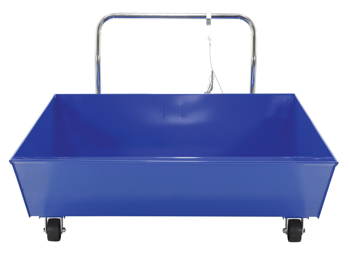 Steel Low Profile Parts Hopper 1/2 Cubic Yd. 2,000 Lb. Capacity BlueThis unique Low Profile parts Hopper has been designed to function as a parts hopper that may be dumped with the assistance of a fork truck. The low profile design allows the hopper to be placed underneath machinery as a catch basin for parts. The newly designed hopper reduces the hazards, inconveniences, and time associated with collecting parts off the floor. Unit rolls smoothly on casters and includes a removable push handle. Once the material is dumped, the hopper will return to the locked position when lowered to the ground. The included safety restraint should be properly secured to a fork truck before dumping.