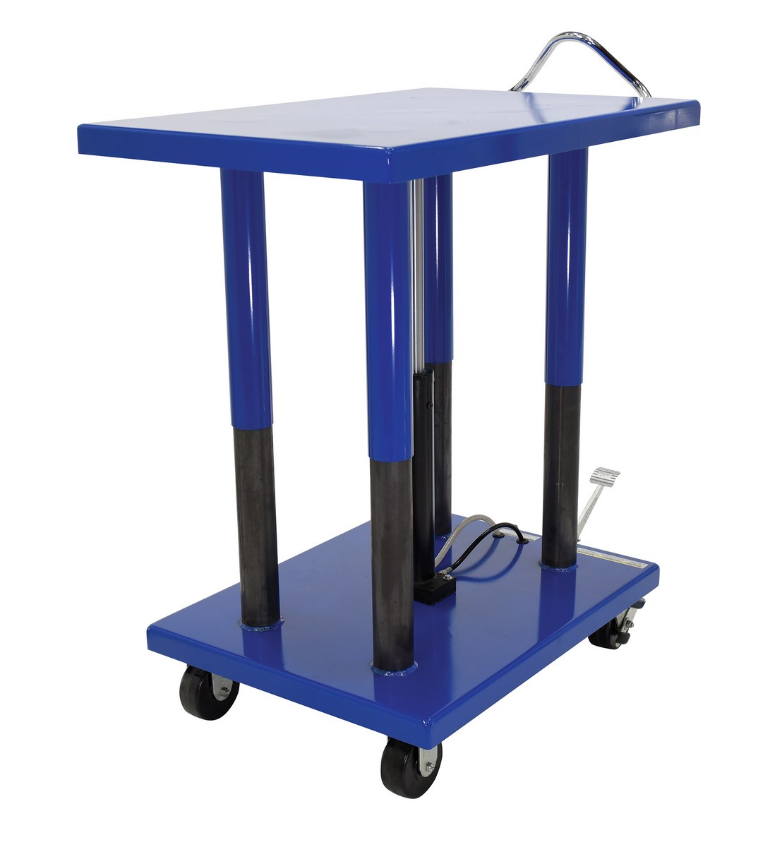 Steel Hydraulic Post Table 32 In. x 48 In. 6,000 Lb. Capacity BlueThe Hydraulic post table is built for heavy-duty shop use. This post table is good for many material handling uses including: lifting dies and castings, moving machine parts, positioning welders work, leveling feed material for pump presses, conveyors and press brakes, and similar material handling jobs. The posts are telescoping to help stabilize and support loads during operation. Table includes four casters; two locking swivel with brakes and two rigid. The unit features a two-speed auto shifter for maximum operator convenience and safe platform lowering.
