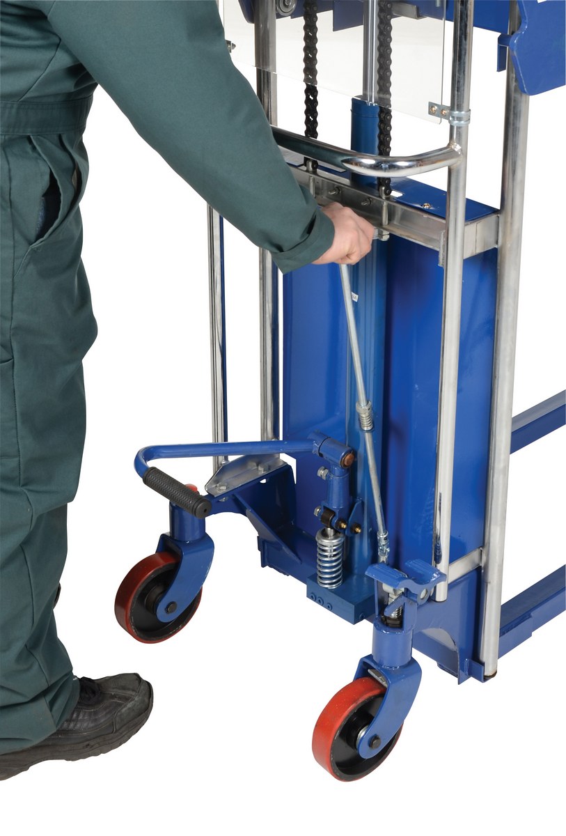 Steel Portable Foot Pump Hefti-Lift 57 In. x 69 In. 300 Lb. Capacity BlueThe Hefti-Lift is a user friendly, portable hydraulic lift. The lift provides reliable, power lifting when moving and positioning loads. It includes a removable platform for operation requiring forks. The non-slip chain is used for accurate positioning while the lift rolls easily on two rigid and two swivel poly-on-steel casters that includes a foot operated brake. The unit has an all welded construction with a chrome platform and uprights. Not for use with pallets.