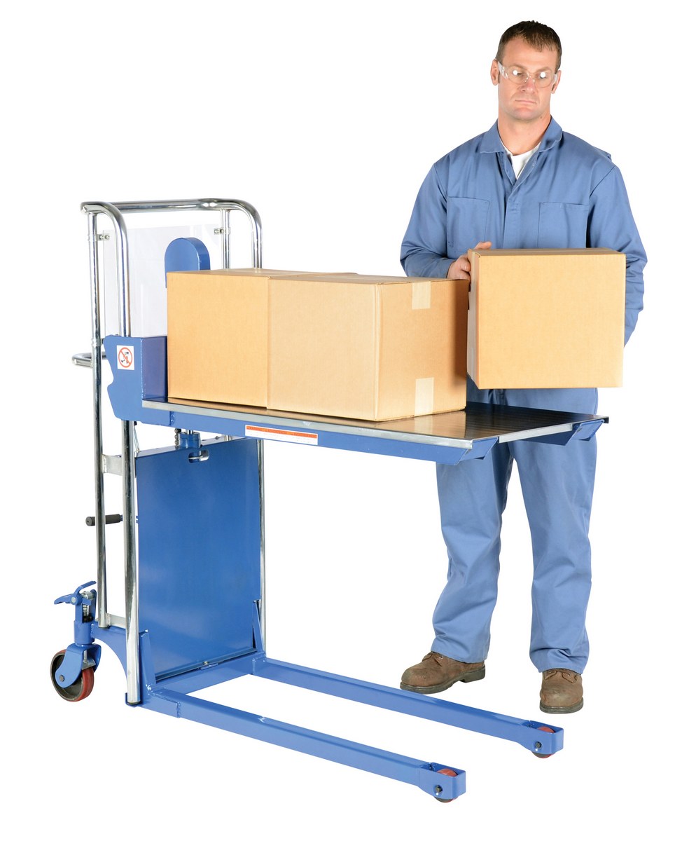 Steel Portable Foot Pump Hefti-Lift 60 In. x 54 In. 400 Lb. Capacity BlueThe Hefti-Lift is a user friendly, portable hydraulic lift. The lift provides reliable, power lifting when moving and positioning loads. It includes a removable platform for operation requiring forks. The non-slip chain is used for accurate positioning while the lift rolls easily on two rigid and two swivel poly-on-steel casters that includes a foot operated brake. The lift is all welded construction with a chrome platform and uprights. Not for use with pallets.