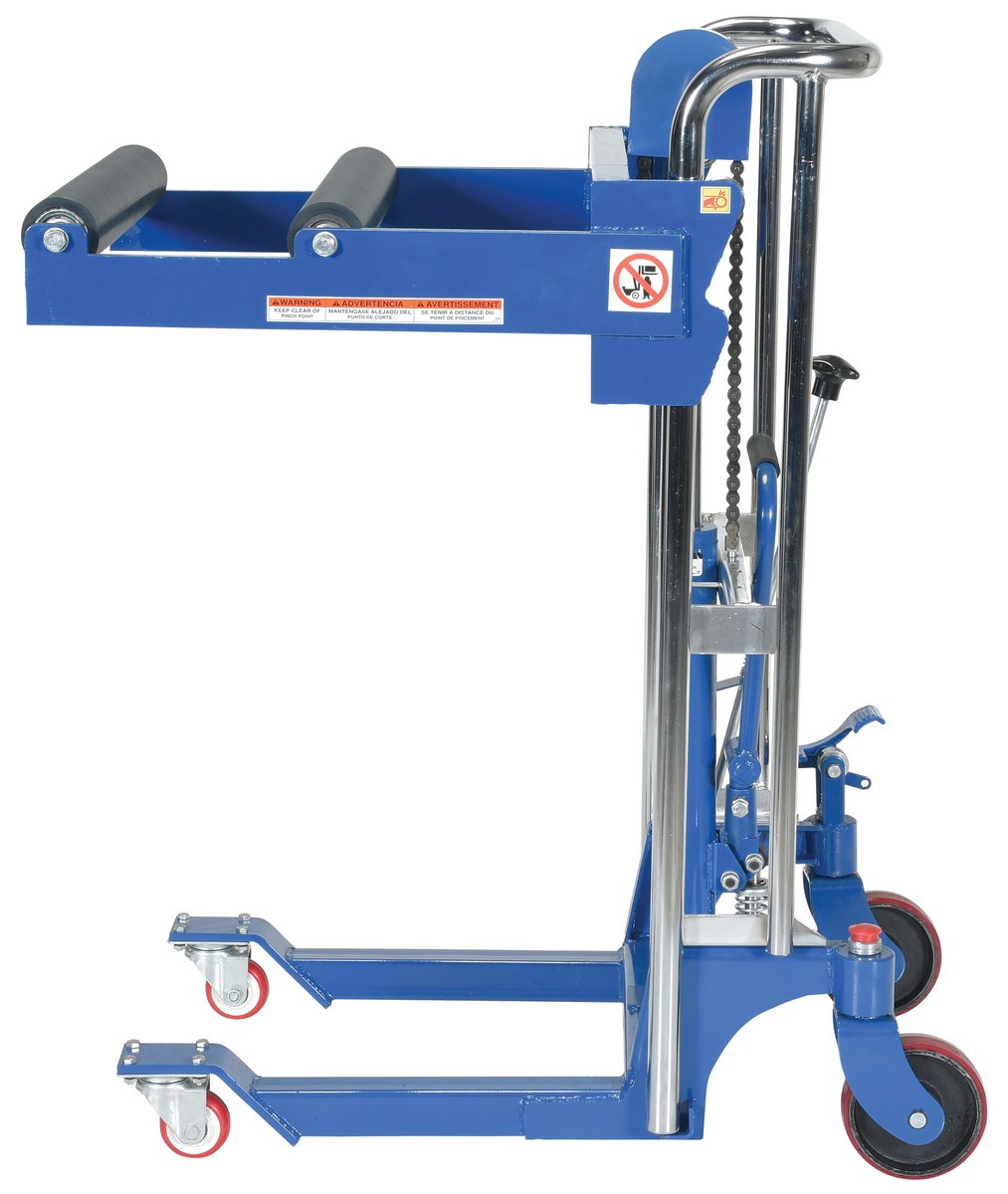 Steel Roller Work Positioner 21 In. Roll Diameter 800 Lb. Capacity BlueThe roller work positioner is a wonderful addition to material handling and shipping facilities. The positioner allows the user to transport heavy large rolls of material with ease. The simple cradle design of the platform prevents any movement during transporting. A foot pump operation gives the user the ability to adjust the height to an exact measurement for smooth loading/unloading. The attached handle stands at an ergonomic height to diminish the chance of bending during operation. For best use, simply slide the product onto the cradle platform and use the foot pump to adjust the height that best suits the environment.