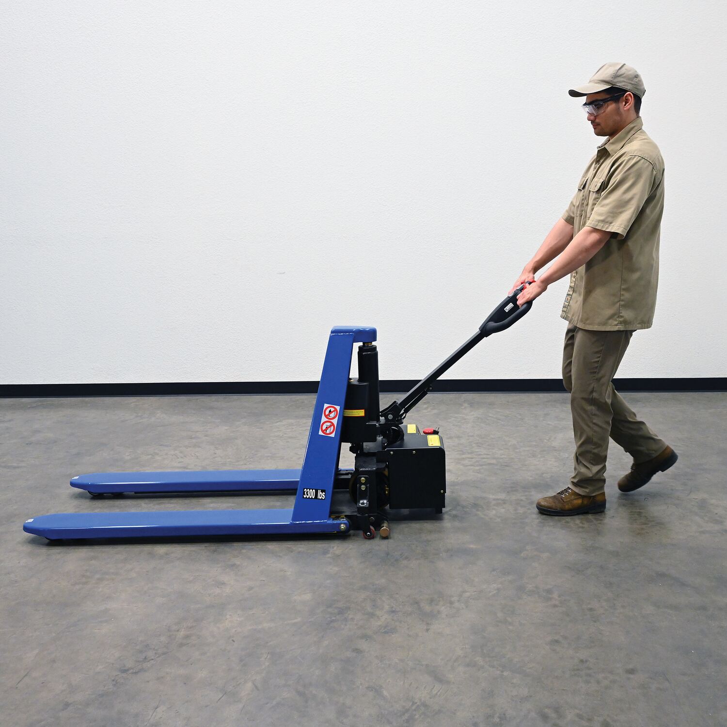 Steel DC Powered Tote Lift 27x45 Traction Drive 3000 Lb. Capacity BlueThis tote lifter is specifically designed to raise open bottom skids, boxes, and baskets. With an ergonomic handle and adjustable speeds, light and heavy loads are easily accommodated. Built-in controls are located on the steering handle and are effortlessly accessible. The open sided design allows for a safe loading and unloading process.
