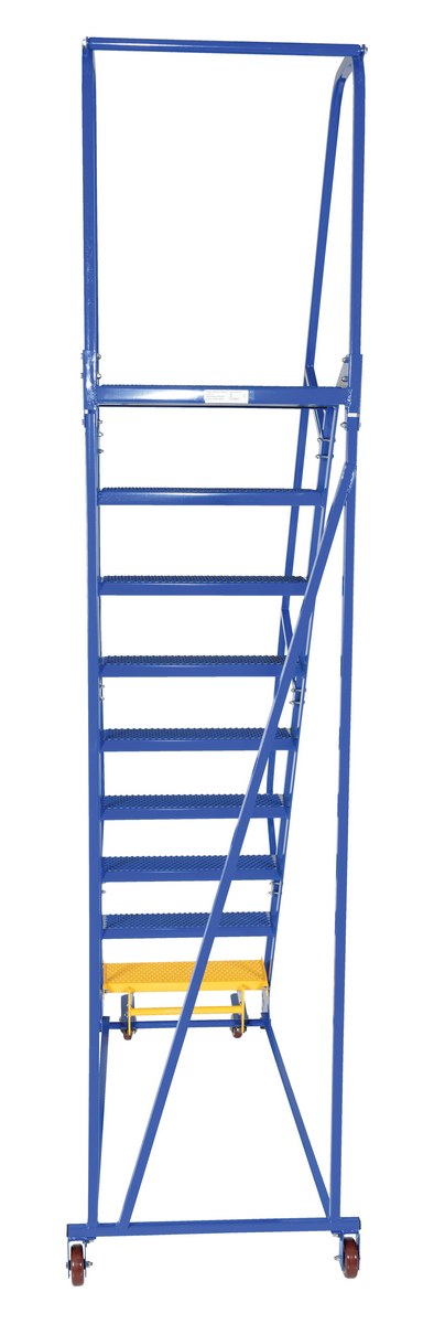 The standard slope ladder is a portable warehouse ladder for every-day use applications. Perforated steps, handrail included, welded square tubular steel construction with powder-coat blue finish. Rubber feet provided for floor protection. Unit has bottom step lock casters for safe use when climbing.