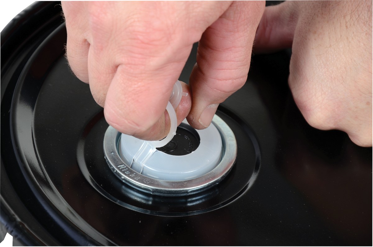 Steel UN Rated Spout Top Lid 5 Gallon BlackSteel lid for use with steel pail. UN rated with spout.
