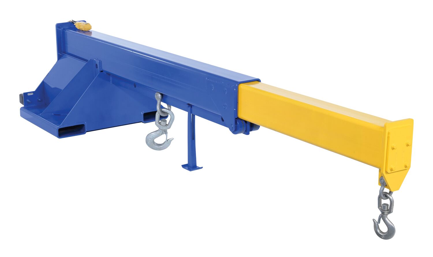 Steel Hydraulic Telescoping Boom 12 Volt DC 24 In. Fork Pocket Center 8,000 Lb. CapacityThe DC powered telescoping boom has all the benefits of the standard lifting boom, except now it has the capability of being powered. The DC powered design includes a power unit housed between the fork tubes and the outer boom. By using the handheld controller the boom can be extended or retracted. The hand held controller connects to the power unit via a pigtail cord. Painted for a smooth finish and to limit abrasion. Includes two (2) lifting hooks.