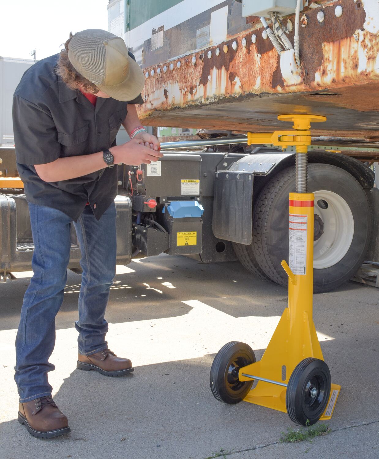 Steel Trailer Stabilizing Ratchet Jack 26-5/8 In. x 17-5/8 In. x 39 In. 100,000 Lb. Static Capacity YellowTrailer stabilizing jacks are used to prevent up-ending of semi-trailers when they are not connected to a tractor during loading and unloading operations. Throughout the loading and unloading process it is always recommended to use two jacks, one on each side of the front of the trailer. The trailer must be situated on a flat, stable and improved (preferably concrete) surface, while the jack sits perpendicular to the underside of the trailer. Every jack is built of a high strength steel construction with a flush-type Zerk fitting for lubricating ACME screw. A yellow powder coat finish and a reflective collar for visibility at night are both included. Each jack meets OSHA regulations when used with wheel chocks. **The color of handles included with models may vary between red and black**.