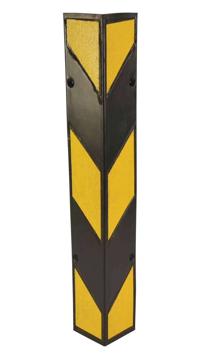 This heavy-duty corner protector is designed to protect corners from damage. Extremely versatile protection for in warehouses, offices, overhead door frames and tracks, or any ninety (90) degree corner. Made from black molded rubber. This corner protector includes reflective safety yellow tape for higher visibility. No pre-drilled holes.