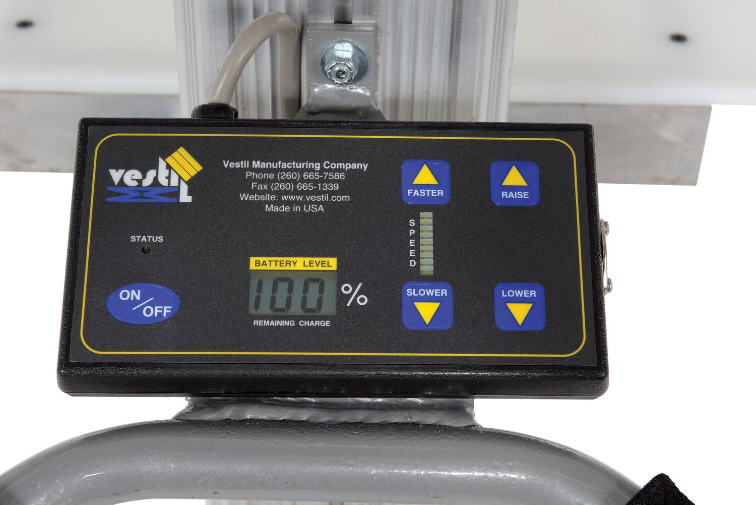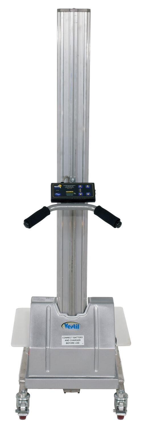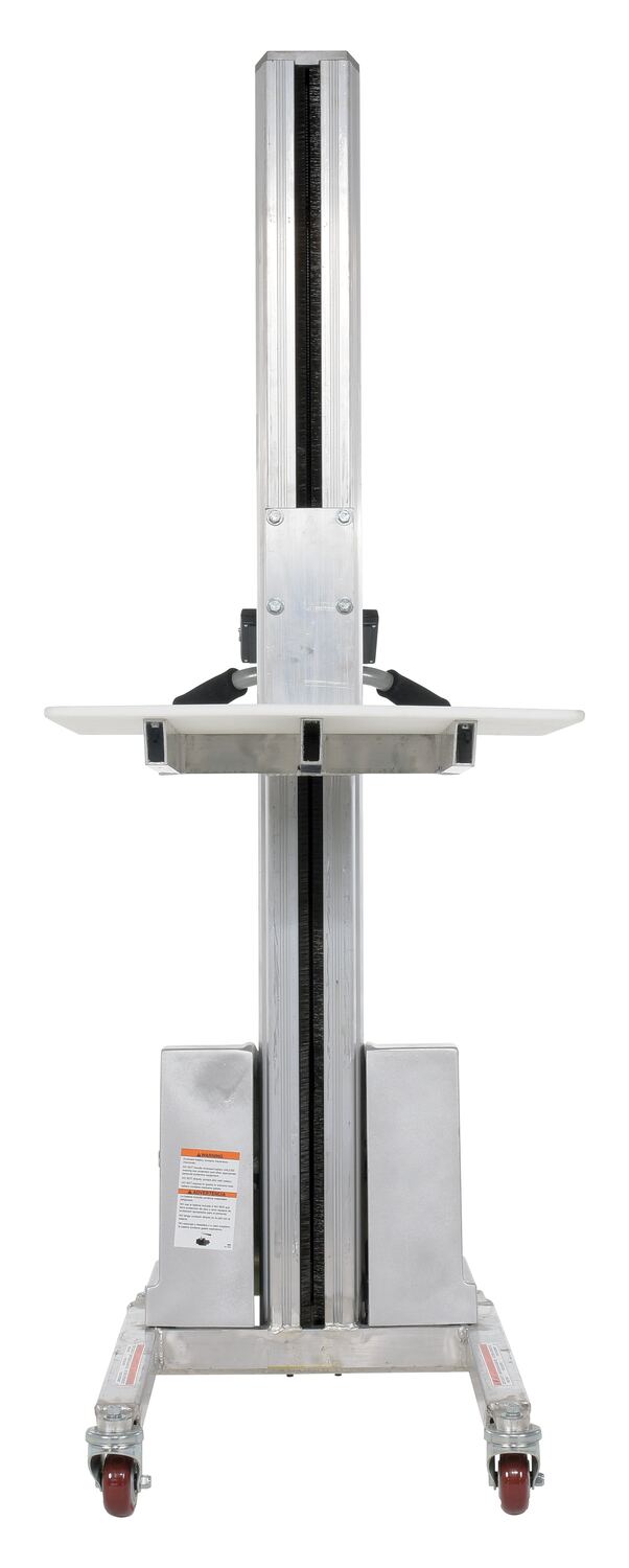 Aluminum Quick Lift DC Powered Lift 57 In. Raised Height 175 Lb. CapacityThe DC powered quick lift is a quiet, lightweight unit used for transport and positioning loads quickly with just the push of the button. The unit is battery operated with a high density polyethylene platform. It features a low profile design for maneuvering in narrow aisles and confined spaces. The poly casters consist of two swivel and two swivel-locking that are standard. The DC system runs with an AC on-board charger.