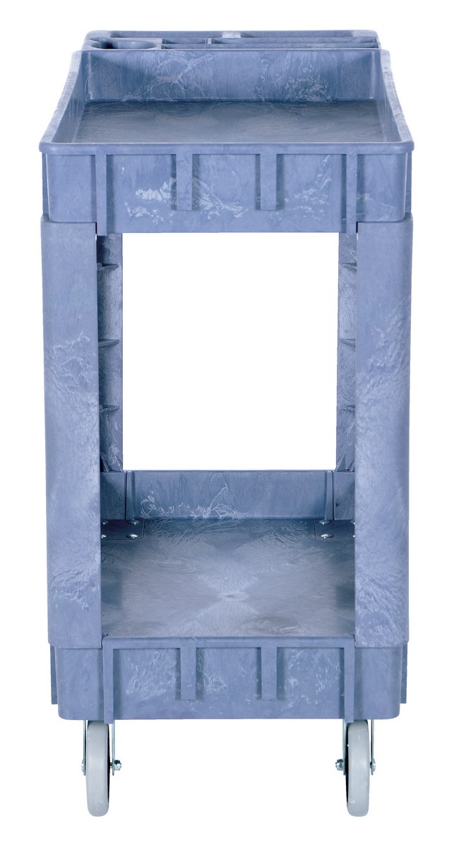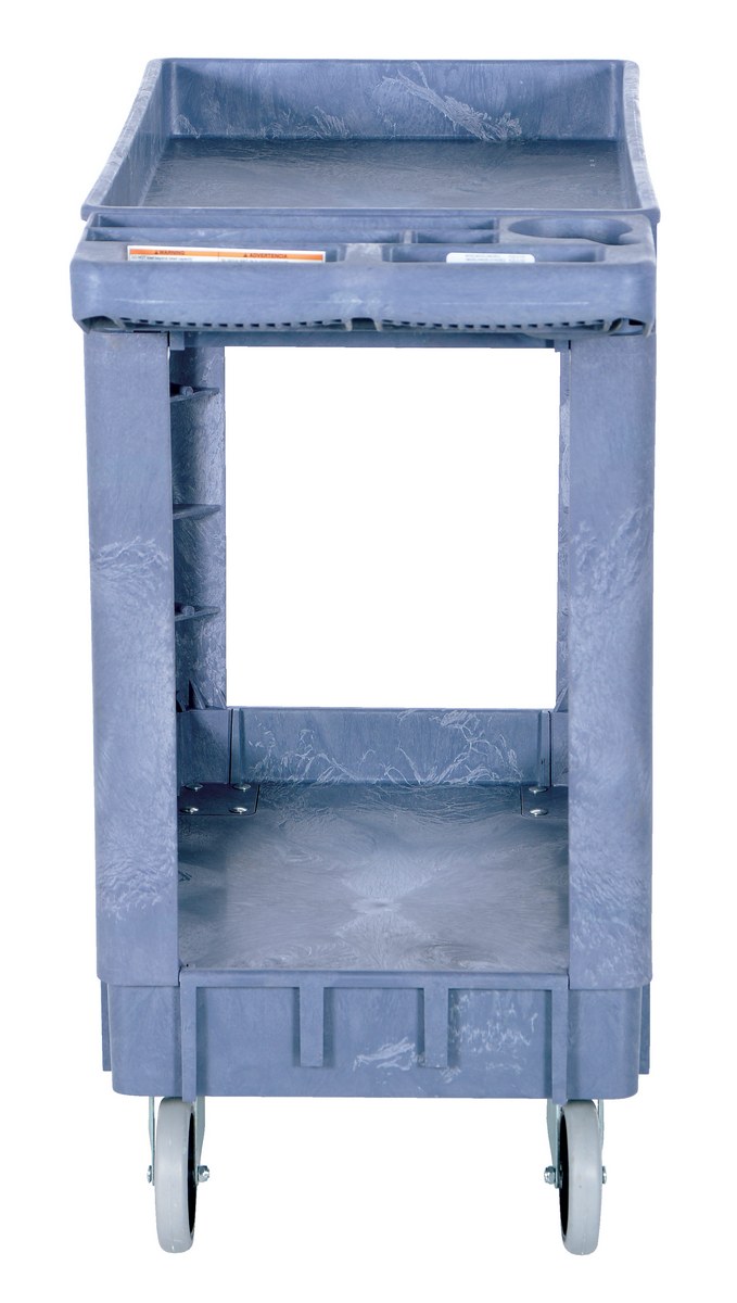 This plastic utility service cart is constructed from durable yet lightweight structural foam plastic. Choose the two (2) shelf design to accommodate your application. Deep lips prevent parts from rolling off. Ideal for mail rooms, shipping docks, grocery stores, warehouses, and inventory rooms.