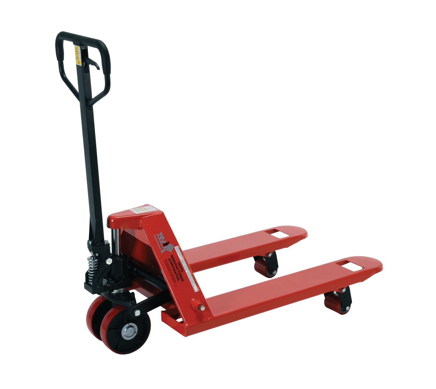 Steel Full Featured Pallet Truck 49-1/2 In. x 27 In. x 48-1/2 In. 5500 Lb. Capacity RedAn economical way for one person to move heavy pallet loads without the use of a fork truck! Includes two articulating steering wheels and two front load rollers. Ergonomic design requires only 75 pounds of pulling force when fully loaded. Steering wheels include bearing dust covers for added life. Nose wheels are located on the front edge of each fork to assist in clean pallet entrance and exit. Reinforced triple-formed steel forks provide twice the strength of standard single-formed forks. Equipped with internally mounted solid steel adjustable push rods. Spring loaded handle automatically returns to vertical position when not in use. Hydraulic pump design facilitates easy-access seal replacement. Chrome-plated hydraulic pump piston for long seal life.