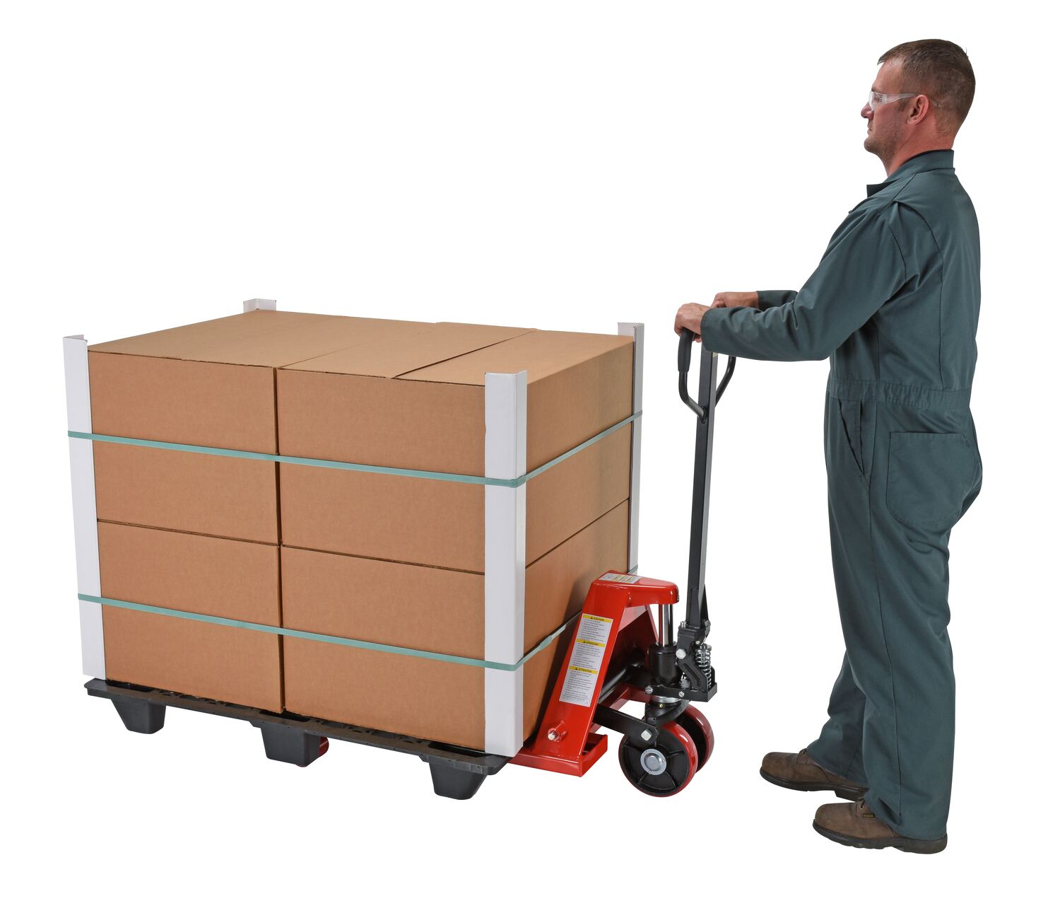 An economical way for one person to move heavy pallet loads without the use of a fork truck! Includes two articulating steering wheels and two front load rollers. Ergonomic design requires only 75 pounds of pulling force when fully loaded. Steering wheels include bearing dust covers for added life. Nose wheels are located on the front edge of each fork to assist in clean pallet entrance and exit. Reinforced triple-formed steel forks provide twice the strength of standard single-formed forks. Equipped with internally mounted solid steel adjustable push rods. Spring loaded handle automatically returns to vertical position when not in use. Hydraulic pump design facilitates easy-access seal replacement. Chrome-plated hydraulic pump piston for long seal life.