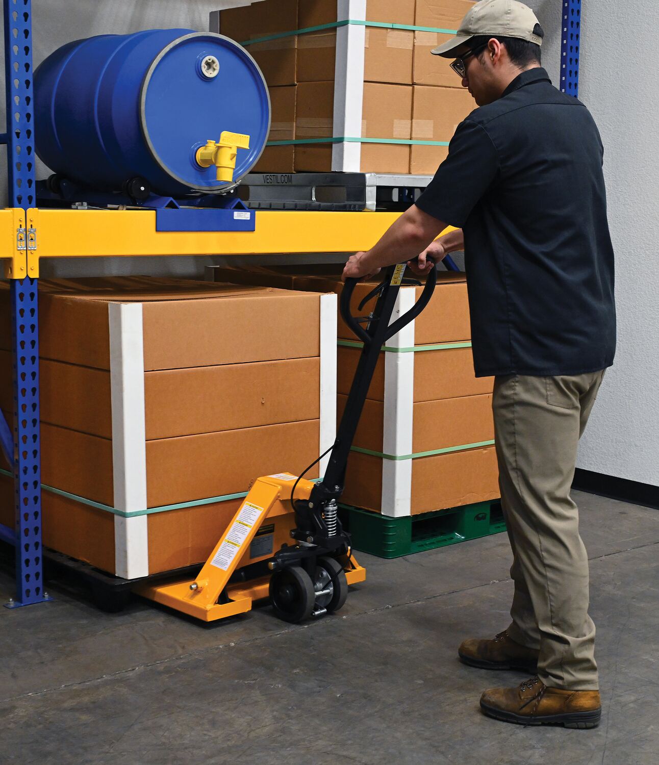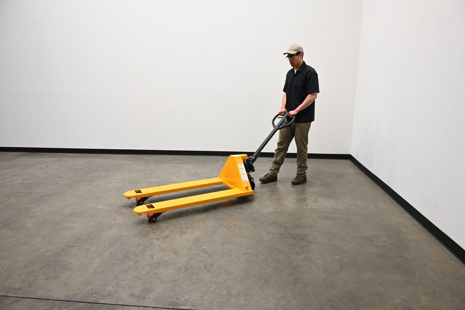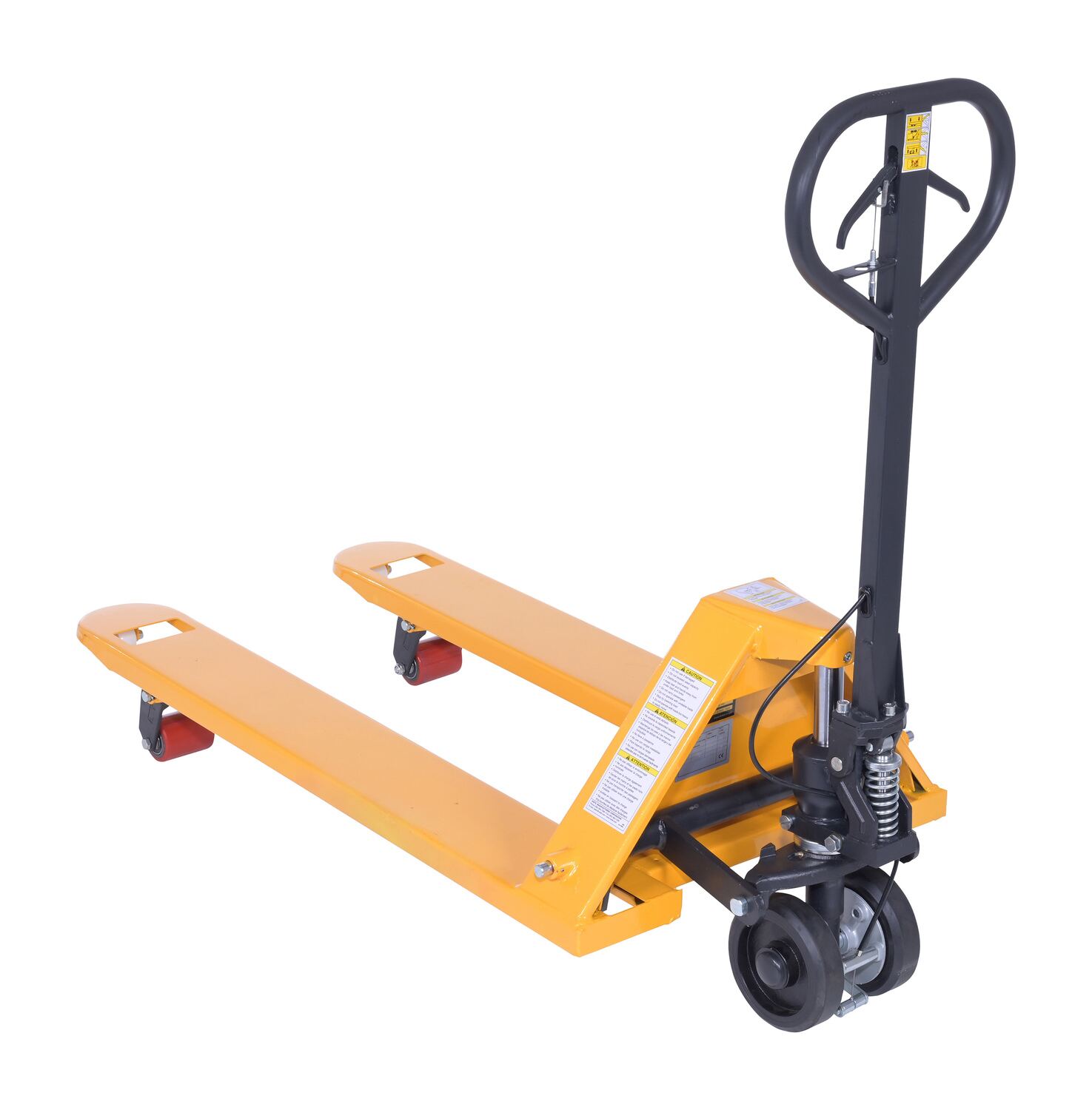 Steel Pallet Truck with Brake 66 In. x 27 In. x 49 In. 5500 Lb. Capacity YellowThe pallet truck with hand brake option allows you to depress the hand brake to slow down or stop truck.