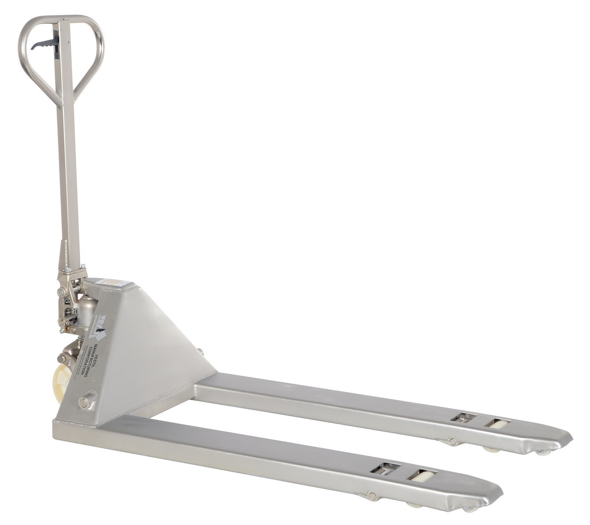 The specialized pallet truck is ideal for sanitary, pharmaceutical, medical, food, and wet environments. Pallet truck has type 304 stainless steel frame and forks for long life in the most harsh environments.