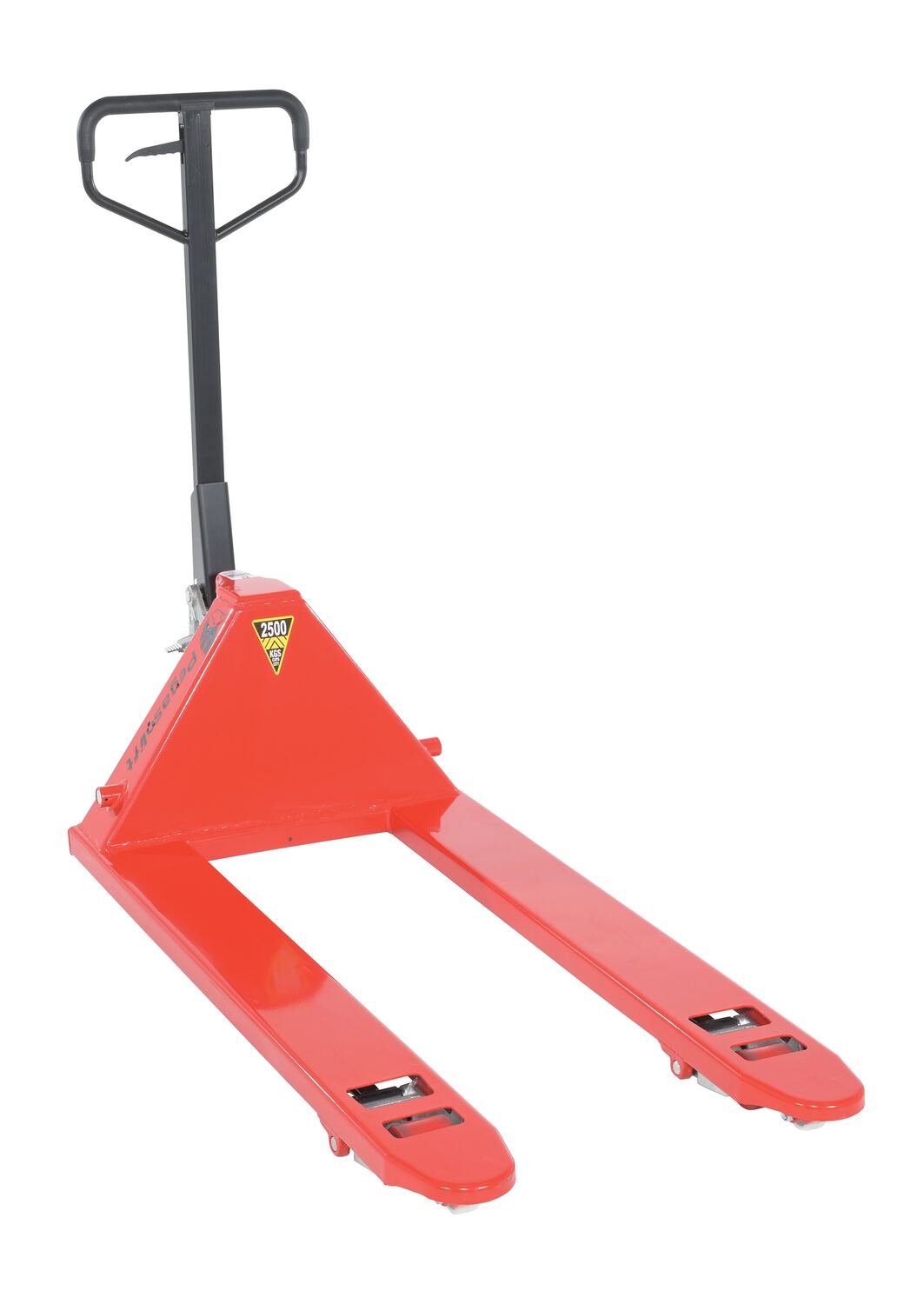 Steel Pegasolift Manual Pallet Truck 27 In. x 48 In. 5,500 Lb. Capacity RedThe full featured pallet truck is an economical way for one person to move heavy pallet loads without the use of a fork truck! Includes two (2) articulating steering wheels and two (2) front load rollers. Nose wheels are located on the front edge of each fork to assist in clean pallet entrance and exit. The unit is equipped with internally mounted solid steel adjustable push rods. A chrome-plated hydraulic pump piston supports long seal life, while the hydraulic pump design facilitates simple seal replacement when needed.