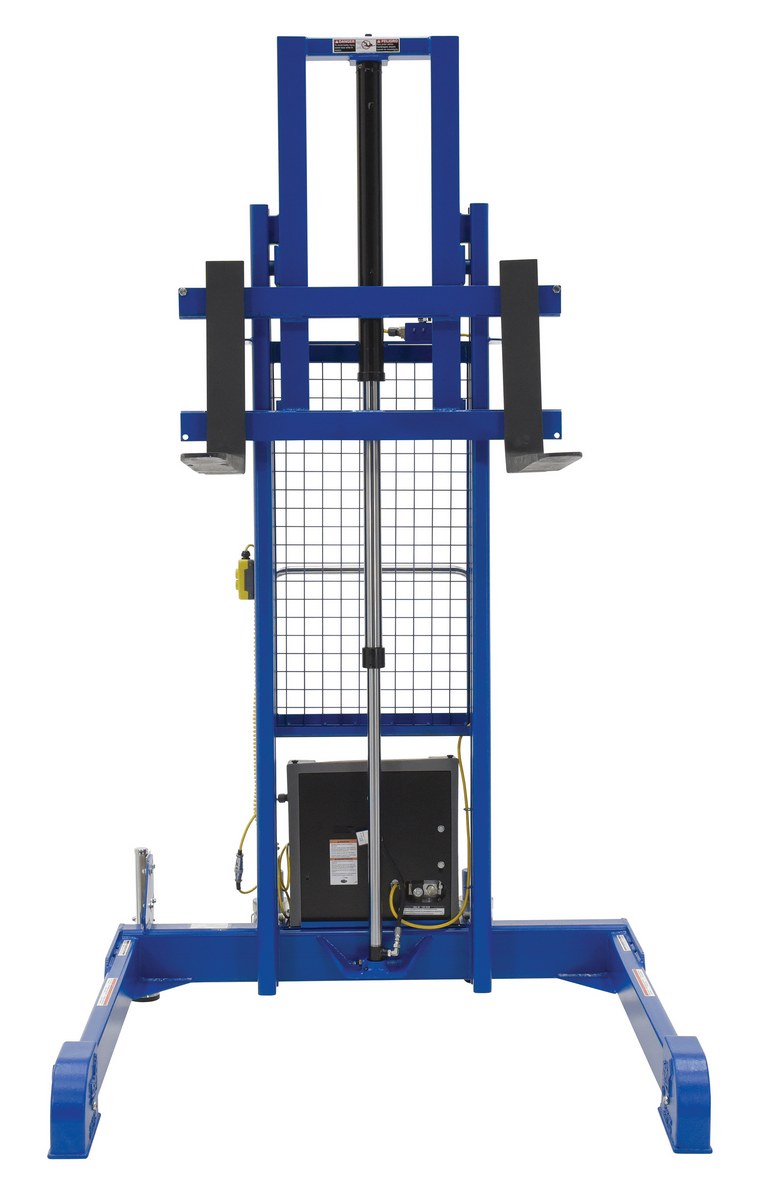 Steel Pallet Master/Server Stacker 12 Volt DC Powered 60 In. Raised Height 4,000 Lb. Capacity BlueThe pallet master/server enables one person to easily move fully loaded pallets without the use of a fork truck. The unique straddle design works well with pallets and skids with and without an understructure. The unit is ideal for loading and unloading semi-trailers. Hand pendant control on an eight (8) foot coil cord standard. Floor lock standard. All welded steel construction.