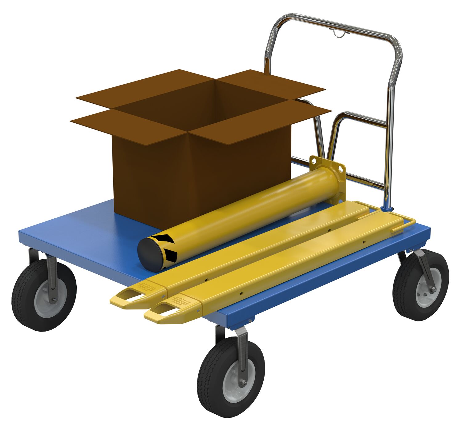 Steel Pneumatic Tire Platform Cart 52-1/2 In. x 48 In. x 46-5/16 In. 1,500 Lb. Capacity BlueThis Pneumatic tire steel Platform Truck travels over rough terrain. Ideal for nurseries, farms, and warehouses. Unit has a removable chrome plated handle and blue baked-in powder-coated toughness.