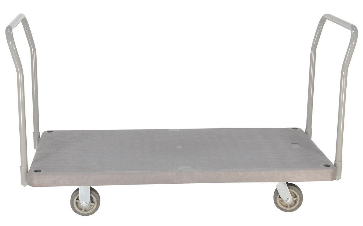 Plastic Heavy Duty Platform Truck 2 Handles 67-1/2 In. x 30 In. x 34 In. 2000 Lb. Capacity GrayThe heavy-duty plastic Platform Truck will not rust, discolor, or warp. Maintenance free and easy to clean. Honeycomb construction is reinforced for longer life. Extra square steel tube underneath platform to reinforce deck strength. This four (4) wheel unit rolls smoothly on polyurethane casters.