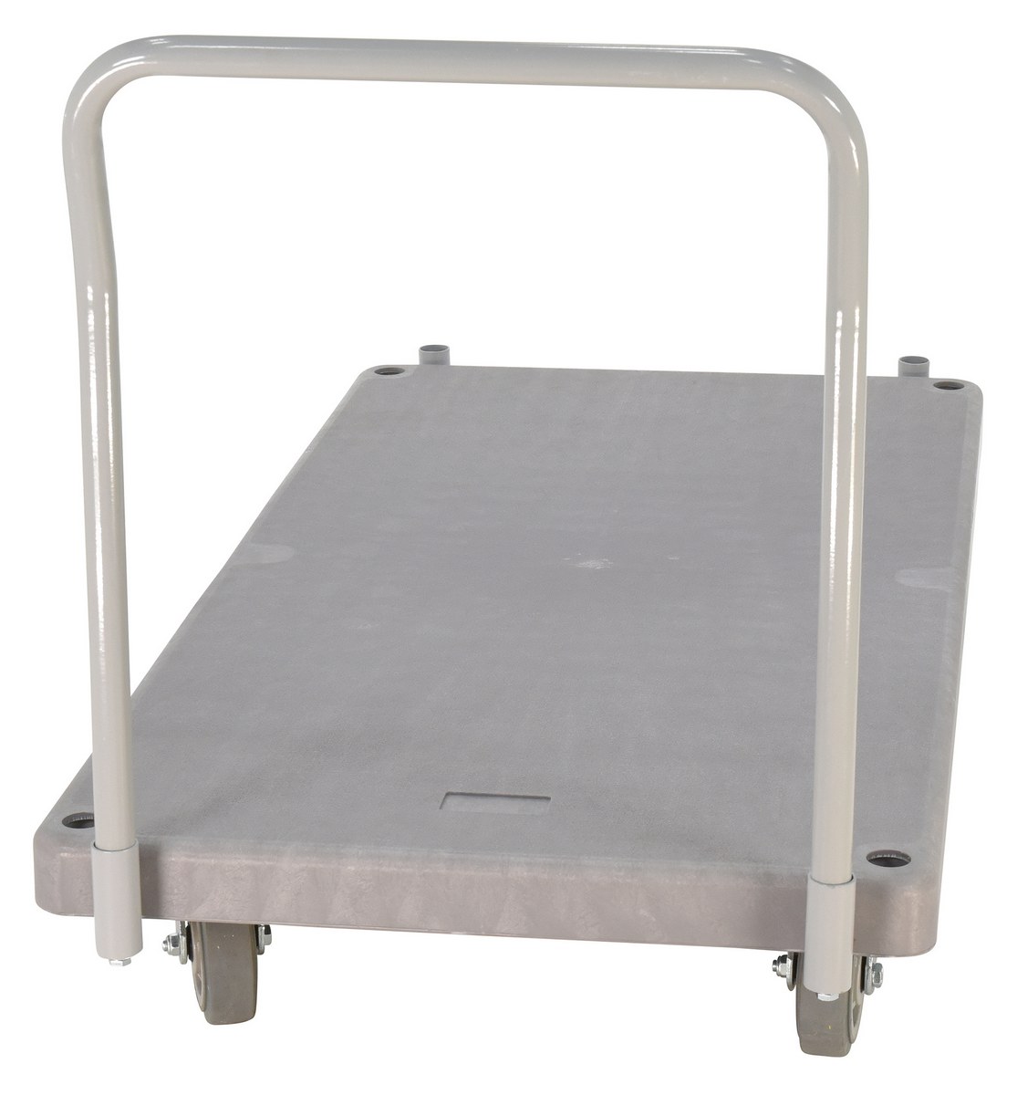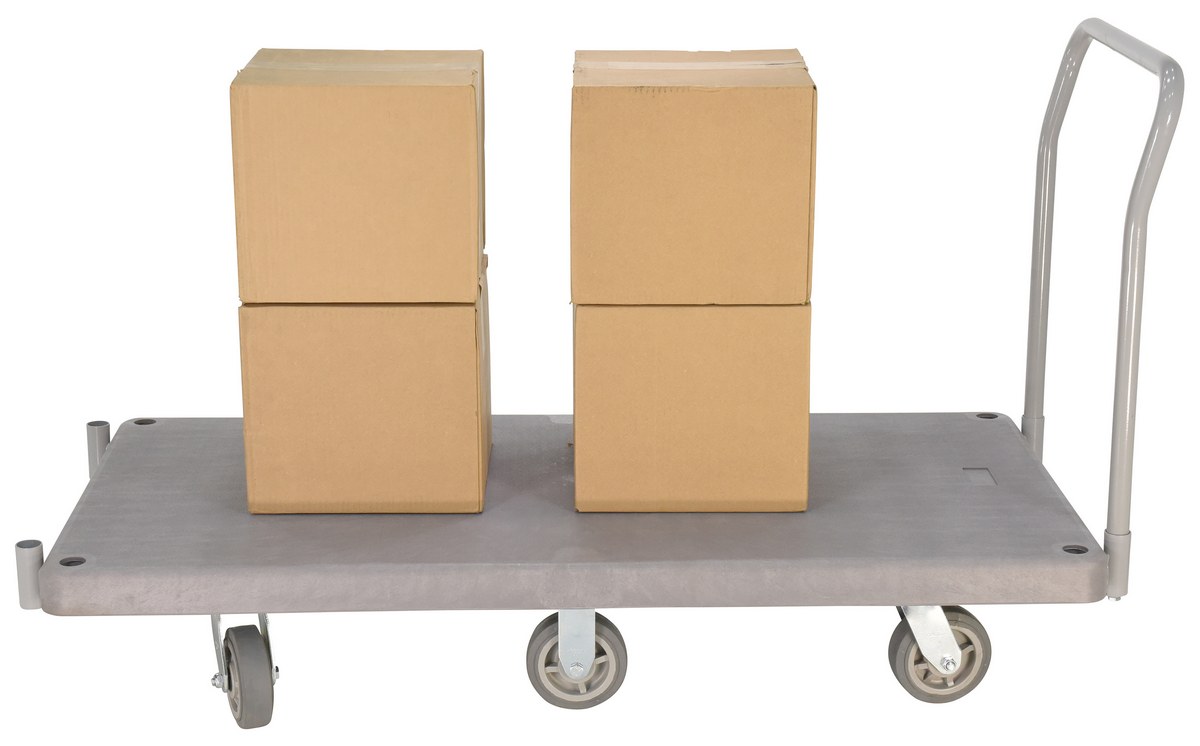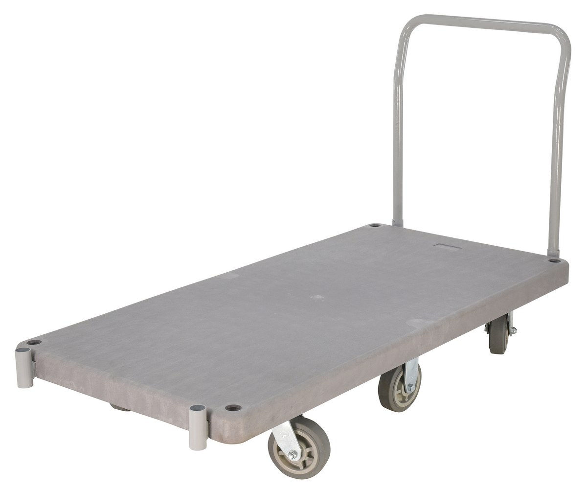 Plastic Heavy Duty Platform Truck 1 Handle 63-1/2 In. x 30 In. x 34 in. 3000 Lb. Capacity GrayThe heavy-duty plastic Platform Truck will not rust, discolor, or warp. Maintenance free and easy to clean. Honeycomb construction is reinforced for longer life. Extra square steel tube underneath platform to reinforce deck strength. This six (6) wheel unit rolls smoothly on polyurethane casters.