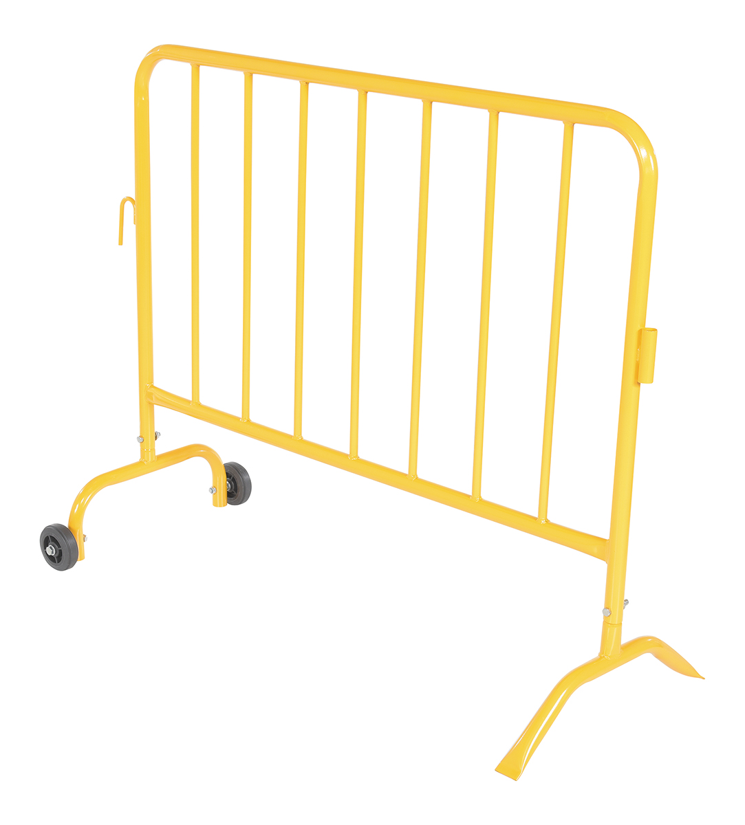 Steel Crowd Control Interlocking Barrier with Feet (1) Wheeled (1) Curved 47-1/2 In. Length YellowThe Heavy Duty crowd control interlocking barrier is attractive and the functional design is ideal for directing personnel. Interlocking portable railing has many commercial and industrial applications. Upright bars are vertically spaced. Each railing includes connectors to attach multiple units together to form long runs. Units are easy to move to meet changing needs. Barriers have flat and compact design to minimize storage space when not in use.