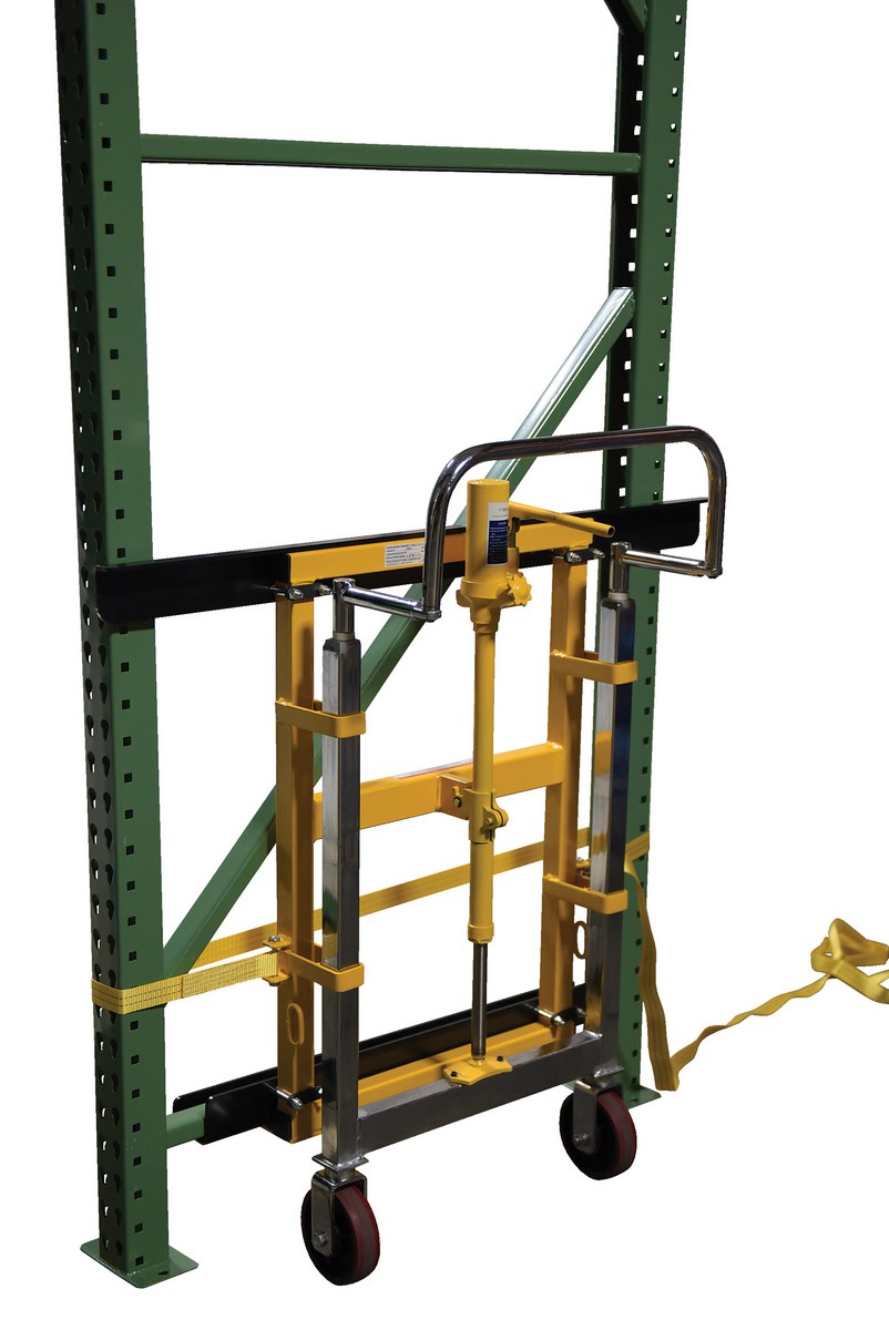 Steel Pallet Rack Lifting Dolly 10 In. x 46 In. x 49-1/4 In. 750 Lb. Capacity YellowThis pallet rack lifting dolly is designed for moving empty fully-assembled pallet racking. Lifting dolly jack includes hydraulic pump to raise pallet rack frame. Frame must have low cross-bar for proper usage. Safety strap is used to secure lifting dolly to pallet rack frames. Steel construction with painted finish. Optional dollies are used to hold frame feet.