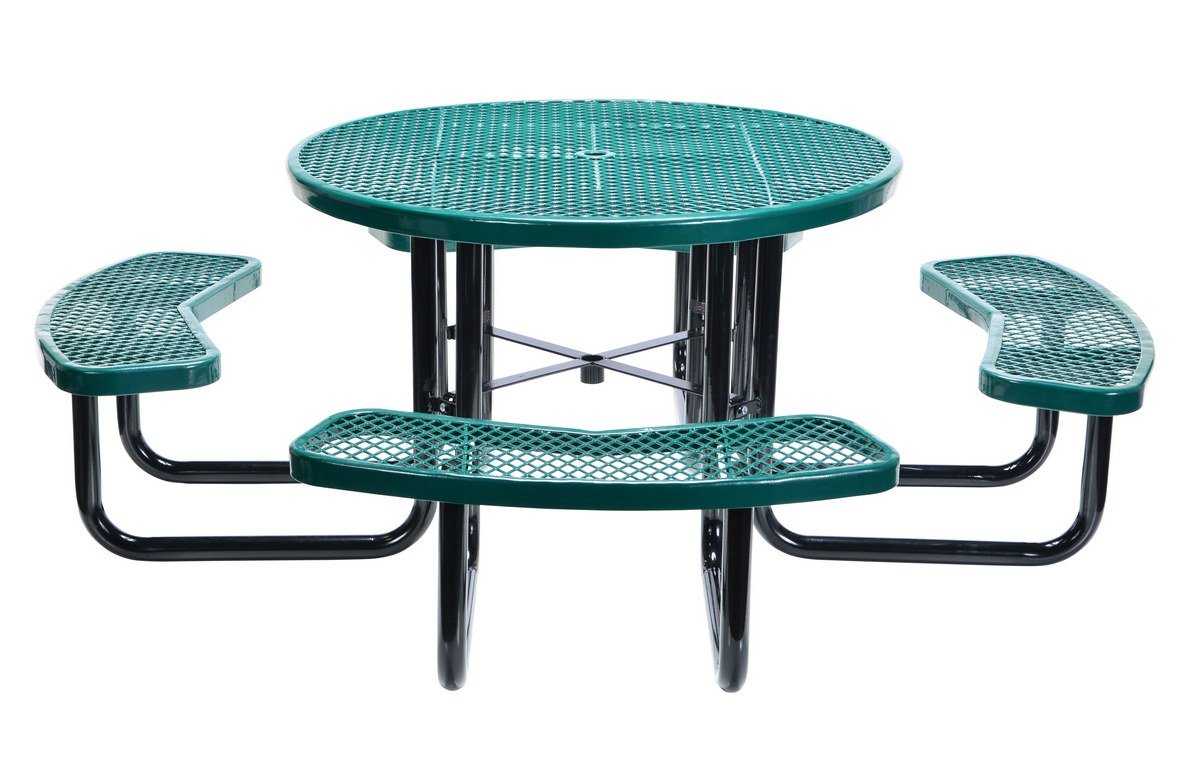 Steel Picnic Table Expanded Metal Round Top 46 In. x 46 In. GreenBuilt to last and highly attractive, this commercial grade metal picnic table is constructed of expanded metal that features a diamond pattern. Finished to endure the elements with virtually no maintenance. Tops and seats are coated with a rugged thermoplastic layer that's attractive and durable. Galvanized tubular steel legs and supports are protected with a black powder coat finish designed for strength and stability.