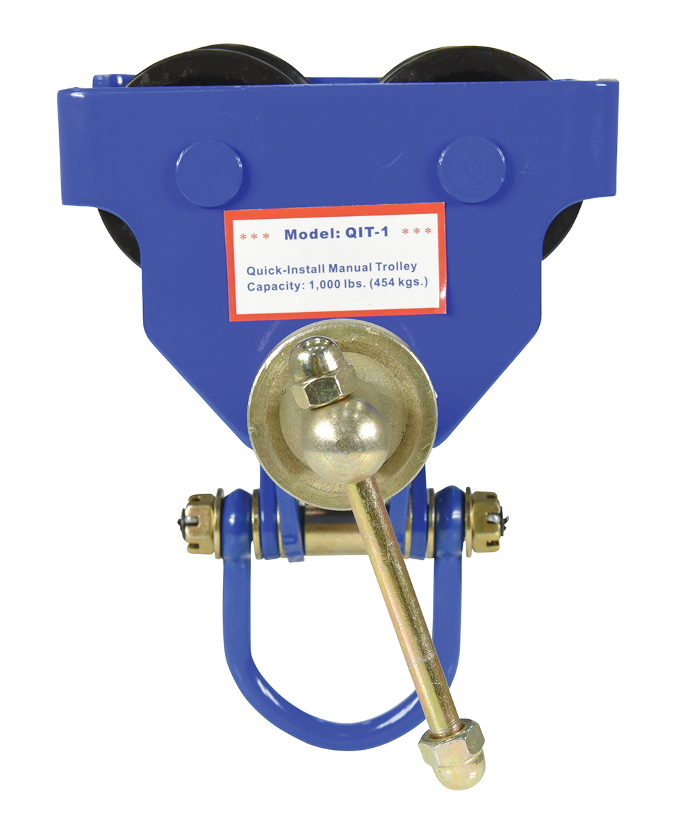 Steel Quick Install Manual Trolley 6-3/4 In. x 11-3/4 In. x 10-1/4 In. 1000 Lb. Capacity BlueThis quick install manual trolley is dependable, easy and safe to use. Designed to easily adjust to the width of virtually any S, H, W and M type I-beam. Width is adjusted with manual screw mechanism. Includes locking ring to prevent trolley width from changing accidentally. Manual screw mechanism may also be tightened to prevent trolley from moving (similar to a beam clamp). Each trolley includes four (4) rollers with sealed bearings for long life. A lifting eye is located at the bottom of the trolley for attaching a hoist (not included).