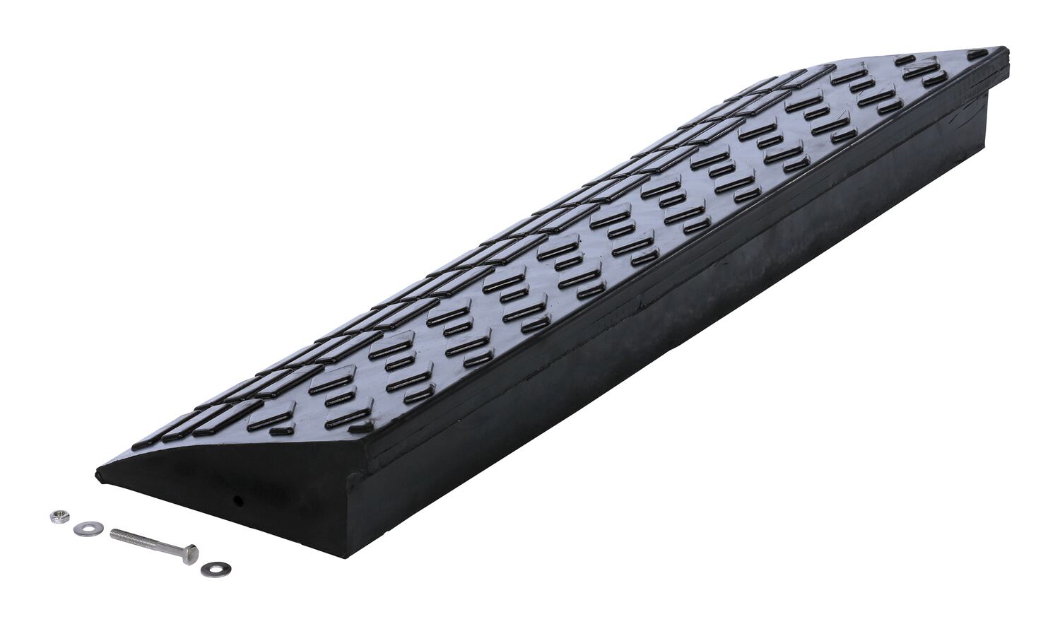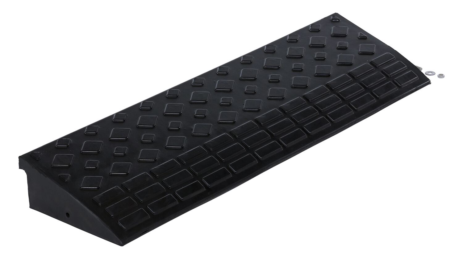 Heavy Duty Rubber Corner Ramp Rectangular 9-11/16 In. x 35-3/8 In. x 3-5/8 In. 4000 Lb. Capacity BlackThe rubber ramp consists of modular rubber that is versatile for use in many applications. Add round corner piece (sold separately) for a finished look. Tread surface pattern for better traction. Includes hardware for connecting ramps together. Heavy-duty molded rubber construction.