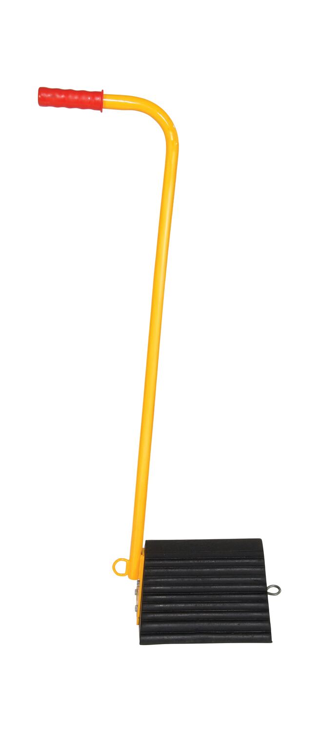The ergo-handle Wheel Chock has an ergonomic design that makes it easy to move wheel chocks in and out of position under trailer wheels. It reduces the risk of back, knee, and foot injuries. The handle is constructed of steel and has a yellow powder coat finish. Hardware included. Assembly required. D-ring provided for attaching security chain. Chain not included.