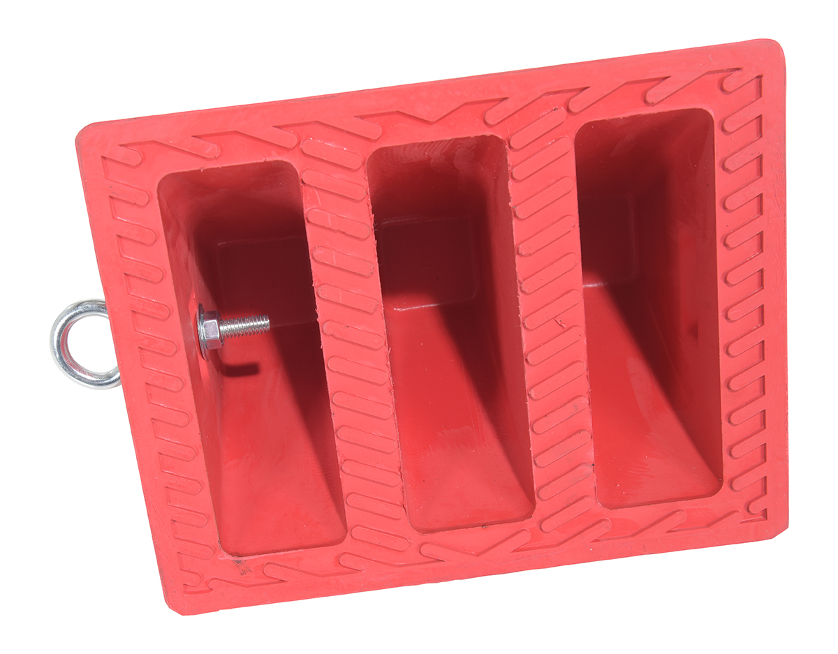 Rubber Wheel Chock with Eye Bolt 9 In. RedA rubber wheel chock is perfect for on the road or in the shop. The tiered rubber design enables the chock to hold more surface area, providing a secure tire position. With a compact, lightweight construction the chock is simple to handle and takes up minimal storage space. Eye bolt is included, giving the user the ability to add additional security to the chock.