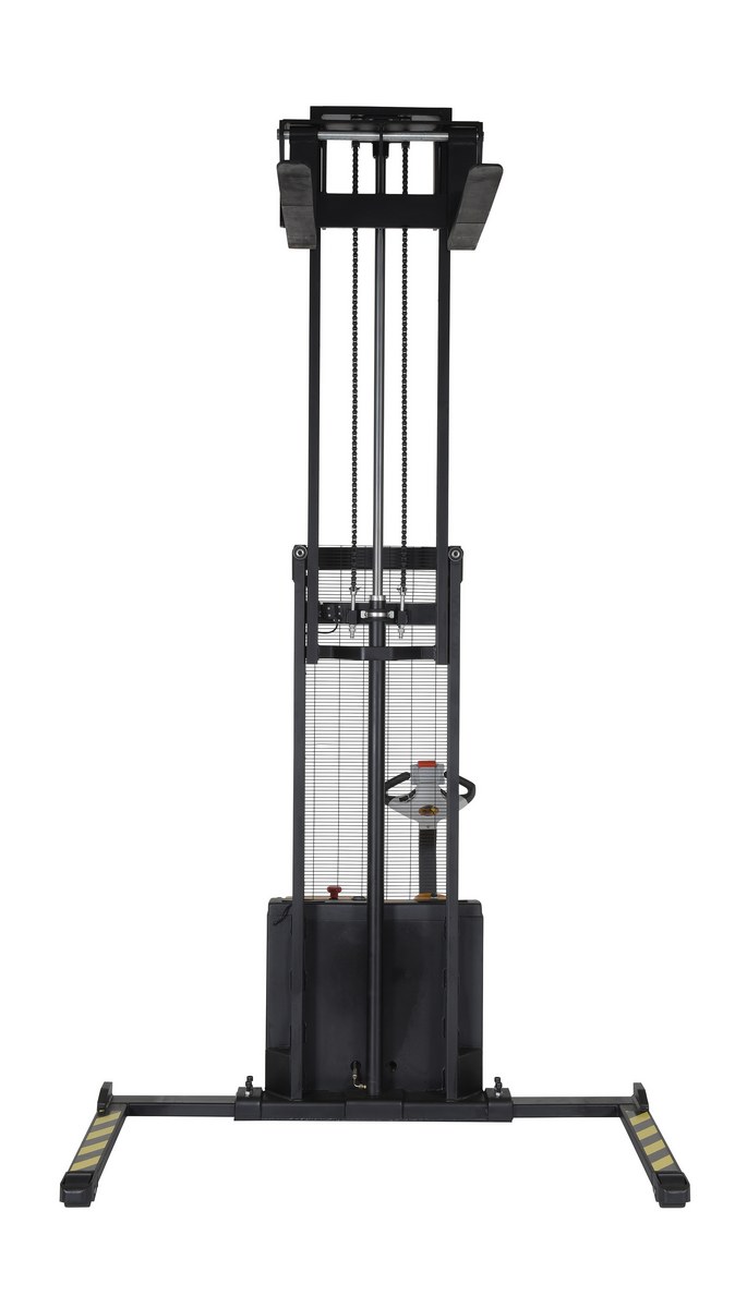 Steel Adjustable Double Mast Stacker 125 In. Raised Height 2200 Lb. Capacity Black / YellowDouble mast fully powered electric stacker transports loads throughout warehouse facilities quickly and with less effort. High torque drive and lift motor handles heavy-duty jobs. Ergonomic handle features easy-to-operate throttle with infinite adjustment of forward and reverse speeds, lift/lower controls, proprietary safety-enhancing emergency reverse function, and horn. Includes an electromagnetic disc brake with automatic dead-man feature that activates when user releases the handle. Powered lifter has two lead acid deep cycle batteries, integral battery charger, and battery level gauge. Stacker rolls smoothly on poly-on-steel steer and load wheels. 3-4 hour operation at full charge - 8 hours when used intermittently.