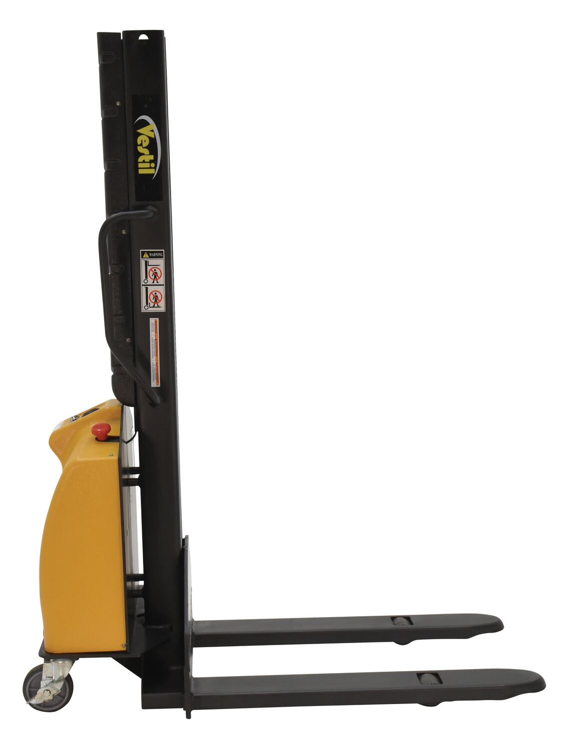 Steel Narrow Mast Stacker DC Powered 63 In. Raised Height Fixed Forks 45-1/4 In. Fork Length 1,000 Lb. Capacity YellowThe narrow mast stacker is great for the shipping and manufacturing facilities. The stacker provides a fast efficient solution to loading and unloading products in closely confined areas. The unit features a simple push button design for lifting control, nylon steering and load wheels for excellent maneuverability, and a battery charger and gauge. Models are available with fixed or adjustable forks as well as fixed or adjustable leg supports.