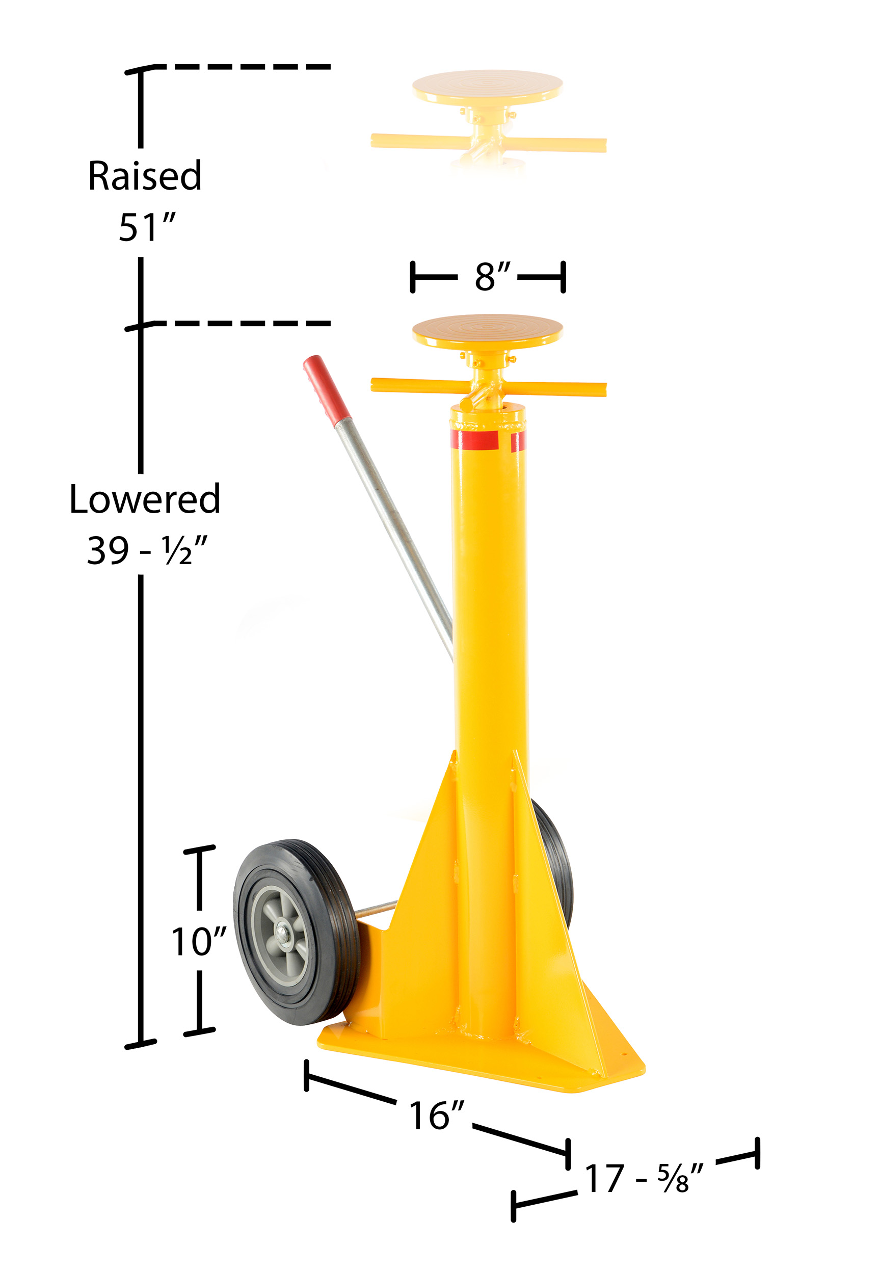 Steel Trailer Stabilizing Spin Top Jack 26-5/8 In. x 17-5/8 In. x 39-1/2 In. 100,000 Lb. Static Capacity YellowTrailer stabilizing jacks are used to prevent up-ending of semi-trailers when they are not connected to a tractor during loading and unloading operations. Throughout the loading and unloading process it is always recommended to use two jacks, one on each side of the front of the trailer. The trailer must be situated on a flat, stable and improved (preferably concrete) surface, while the jack sits perpendicular to the underside of the trailer. Every jack is built of a high strength steel construction with a flush-type Zerk fitting for lubricating ACME screw. A yellow powder coat finish and a reflective collar for visibility at night are both included. Each jack meets OSHA regulations when used with wheel chocks. **The color of handles included with models may vary between red and black**.