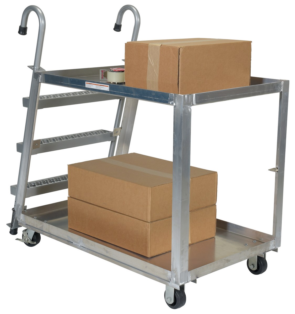 Aluminum Stock Picker with Steel Ladder 52 In. x 27-7/8 In. x 50-3/16 In. 660 Lb. CapacityCombine the mobility of a cart with the versatility of a step ladder with this stock picker truck. Convenient spring loaded steel step ladder holds the cart securely in place while a person is standing on the ladder. Crutch tip ladder prevents the cart from moving while stocking. Springs then return the ladder to the raised position once personnel exit the step. All shelves have the lip turned up to prevent items from falling off. Ladders have a baked in silver powder coated finish.