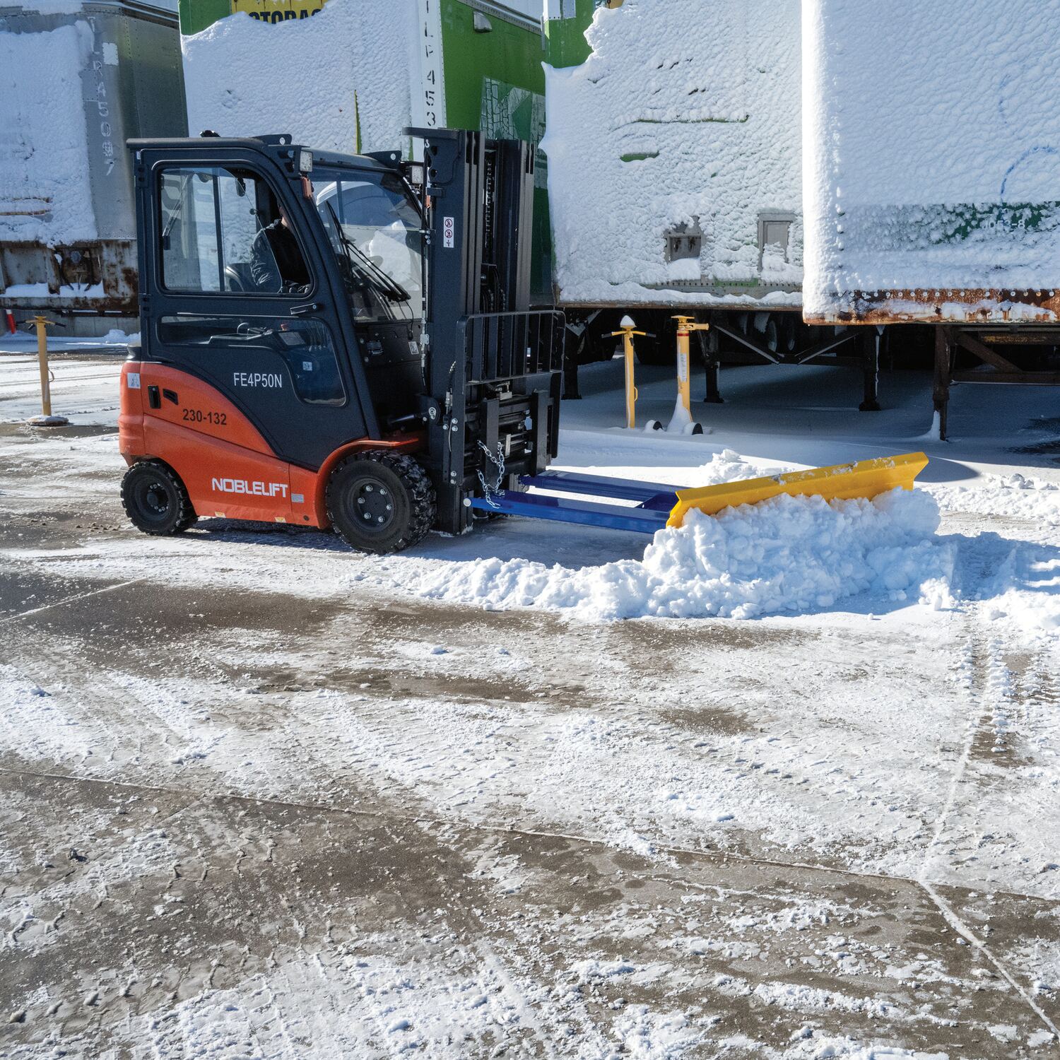 Steel Fork Mount Snow Plow 72" Blade Blue/YellowWhen snow needs moved and removed, look no further than the fork truck snow plow. The unique design attaches to fork truck forks, so no power supply is needed! The design of the plow keeps the weight to the back of the unit, towards fork truck mast. Manual pivot mechanism for angled plowing on both sides. Steel construction with baked in powder coat finish for added toughness.