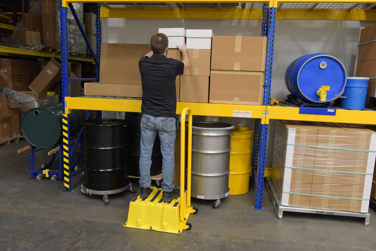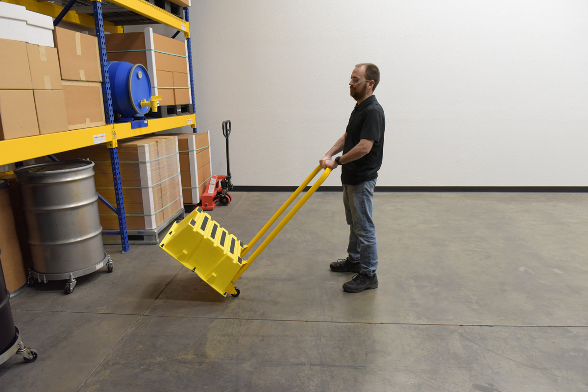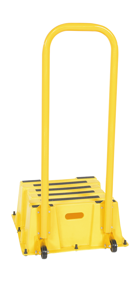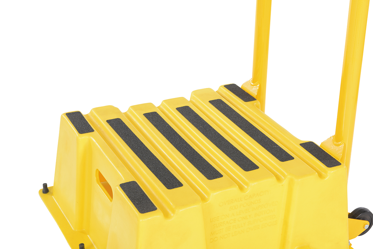 Polyethylene Nestable with Handrails Casters 1 Step 500 Lb. Capacity YellowA poly step stool is a great asset for on the go or in a permanent setting. A lightweight design with front and side cutout handles, allow the user to easily transfer the stool to a preferred spot. The taped step surfaces ensure safe footing while traversing up and down the steps. Includes bolt on handrail and casters. The hand rails height allows the unit to be pushed or pulled into the desired position, minimizing bending and twisting by the user. Steps can be nested to minimize footprint when not in use.