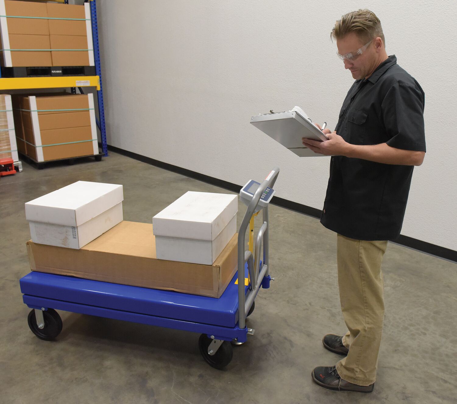 Steel Platform Truck with Scale 53-7/8 In. x 24 In. x 40 In. 3,600 Lb. Capacity BlueThis steel Platform Truck with solid, smooth deck, features structural reinforcement underneath for extra strength. Includes one (1) removable high-polished steel handle and a functional scale. The scale gives users the ability to weigh items during picking rather than in congested designated shipping areas. The readout screen sits atop a built in pedestal, centrally located under the handle. Durable blue powder coat finish.