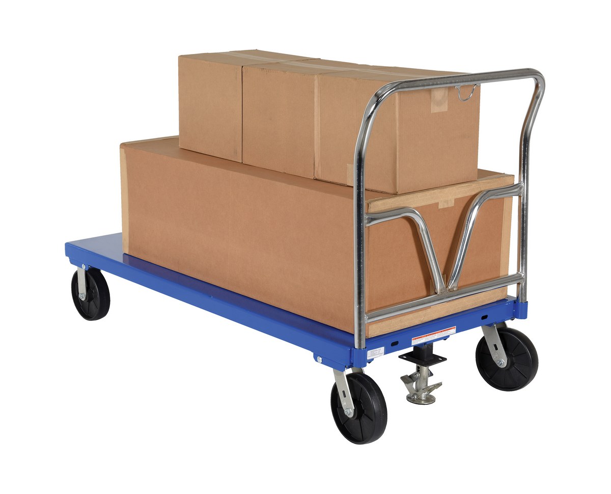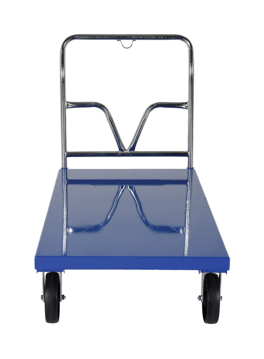 Steel Platform Truck 65-1/2 In. x 30 In. x 40 In. 3,600 Lb. Capacity BlueThis steel Platform Truck with solid, smooth steel deck is all welded and features structural reinforcement underneath for extra strength. Includes one (1) removable high-polished steel handle and rolls smoothly on two rigid and two swivel casters. Comes standard with a floor lock and a durable blue powder coat finish.