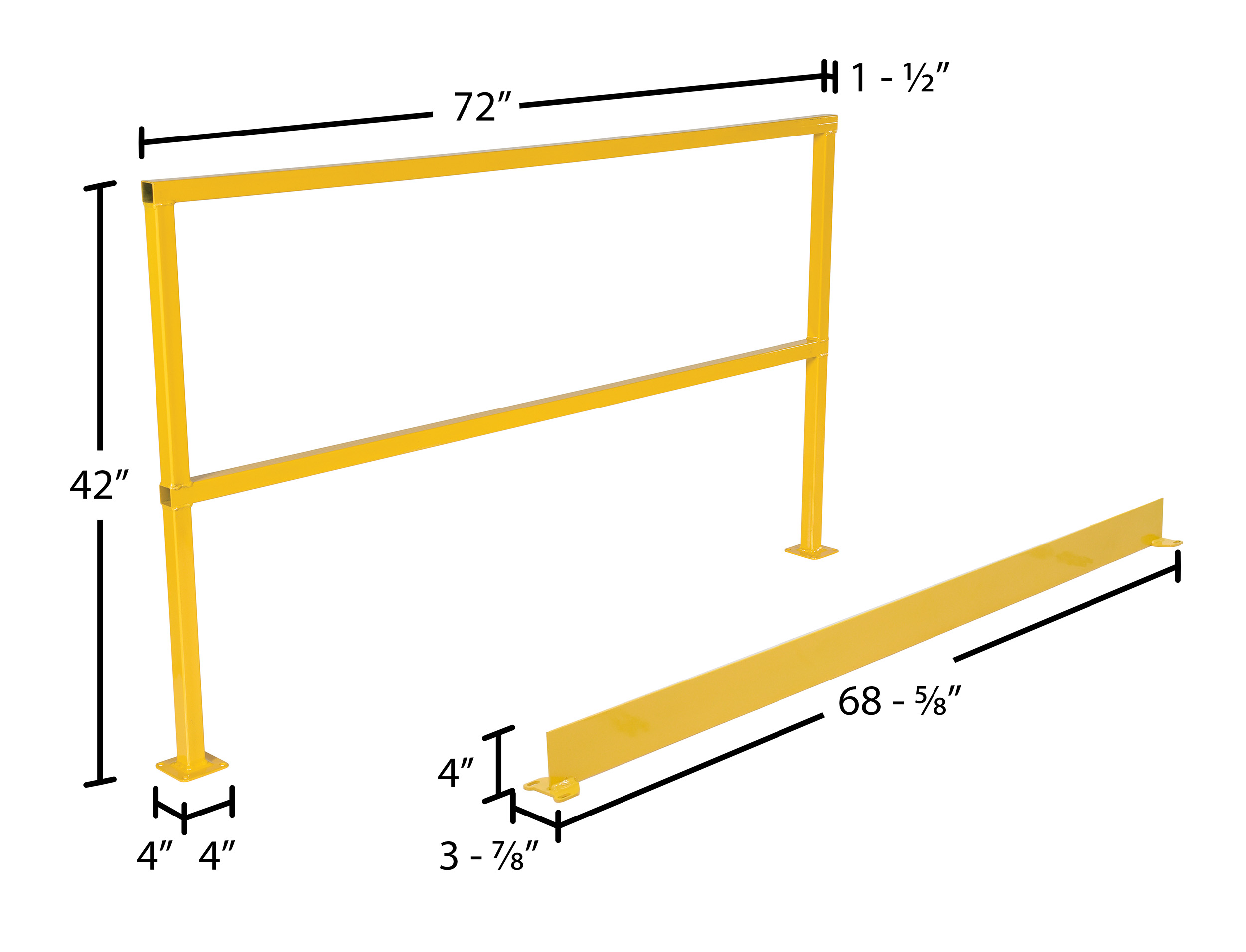 Steel Safety Handrail with Hardware and Toe Board 74-1/2 In. x 4 In. x 42 In. YellowSteel square safety Handrail provides an economical way to protect people and machinery. Applications include loading docks, floor openings, walkways, and mezzanines. Highly visible safety yellow powder coat finish, hardware included.
