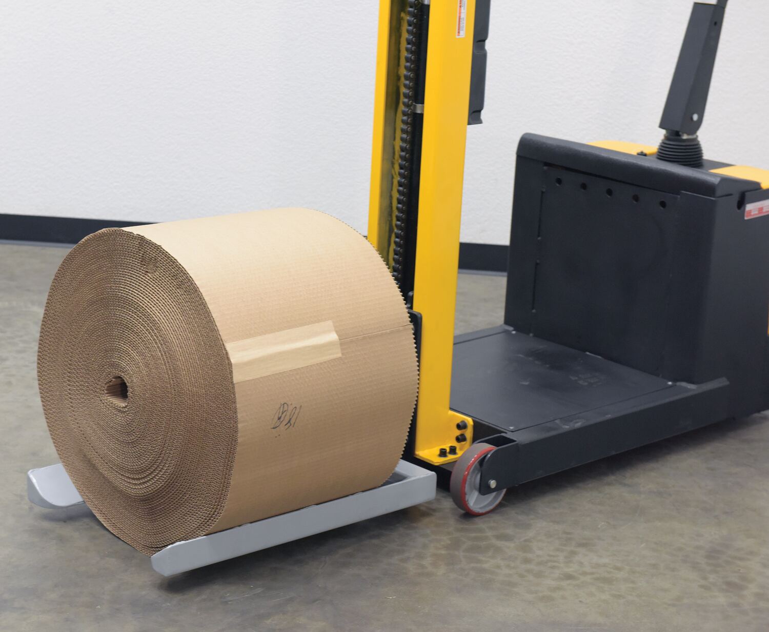 Large rolls can be difficult to maneuver and lift, but with the roll lifter stacker attachment that chore just became a joy! The forks on this attachment are fixed, so there is no hassle of adjusting the fork span before or between loads. With a unique design, the roll sits in a cradle like support system which keeps the roll secure during transport.