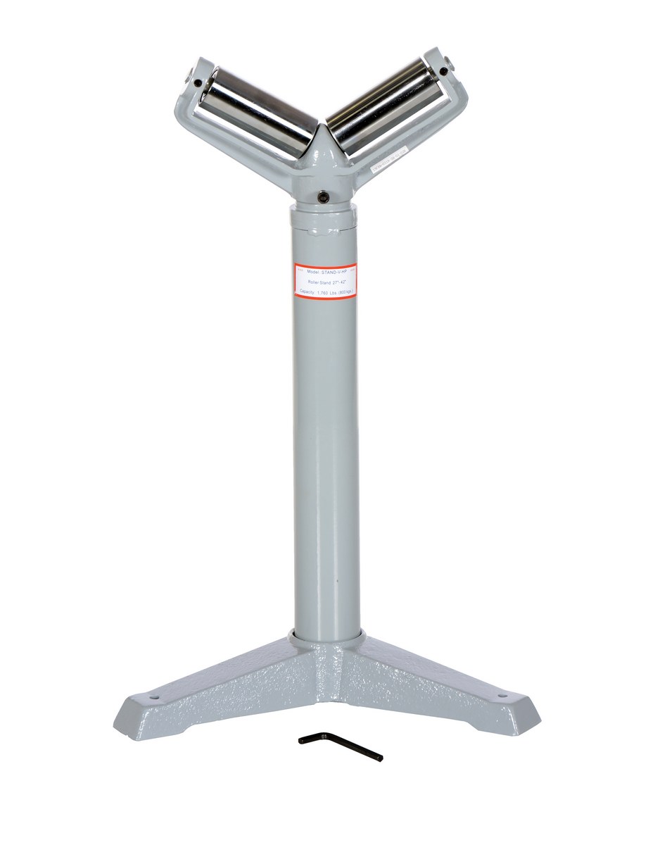 Steel Roller Stand Quantity 27 In. to 42 In. Raised Height 1,760 Lb. Capacity SilverThe deluxe roller stand is designed for use as an extra hand when working with long materials. Each stand includes chrome plated rollers and heavy-duty cast-steel base. This roller stand is a v-groove roller design. The height of each stand is adjusted with a friction lock screw or a gas charged cylinder. The unit is great for use in machine and wood shops.