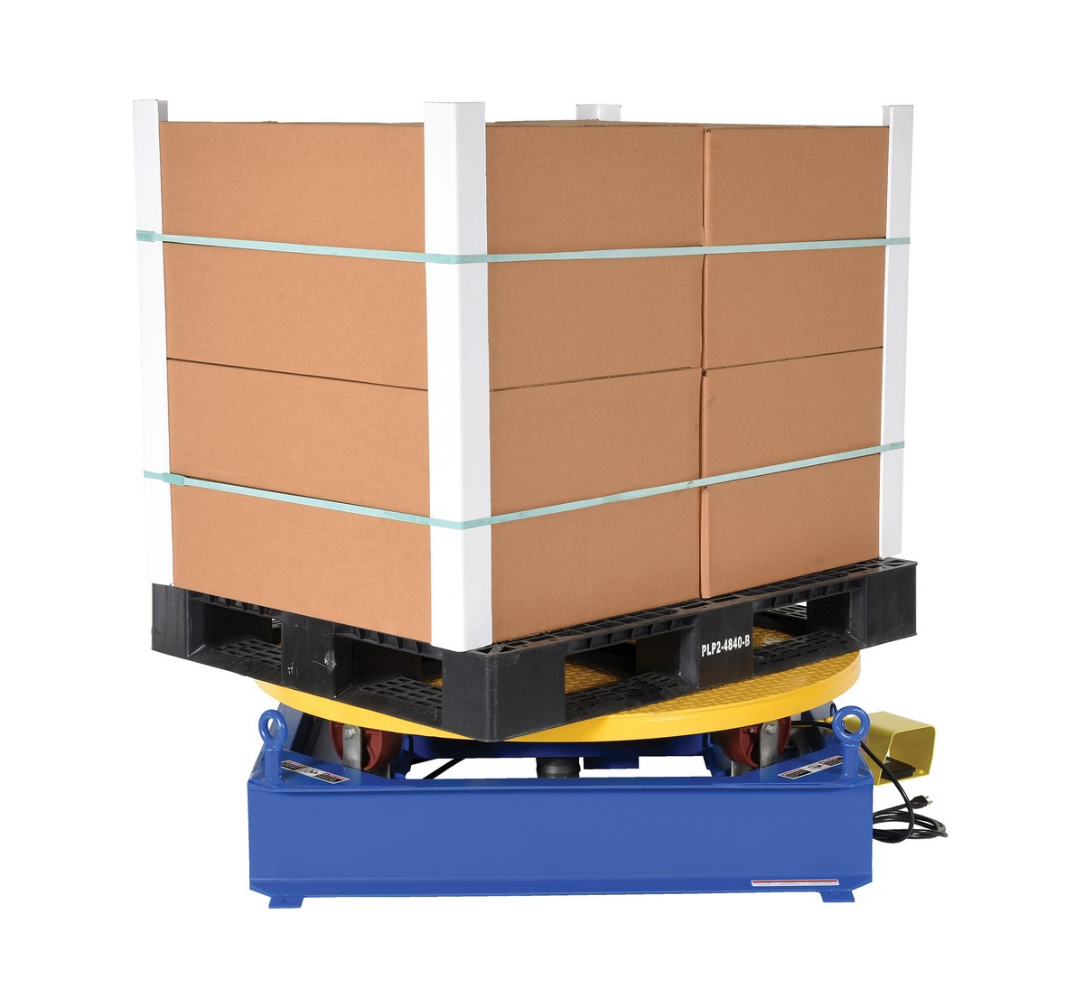 Steel Electric Hydraulic Stand Alone Powered Carousel 4,000 Lb. Capacity Blue / YellowThe stand alone powered carousel easily rotates pallets, skids, and other large objects with this rugged powered carousel. This carousel includes a round tread plate turntable that is supported with inverted casters for use as bearings. Also included; turntable, base, power unit, and fixed-speed control. Unit has a heavy-duty steel construction.
