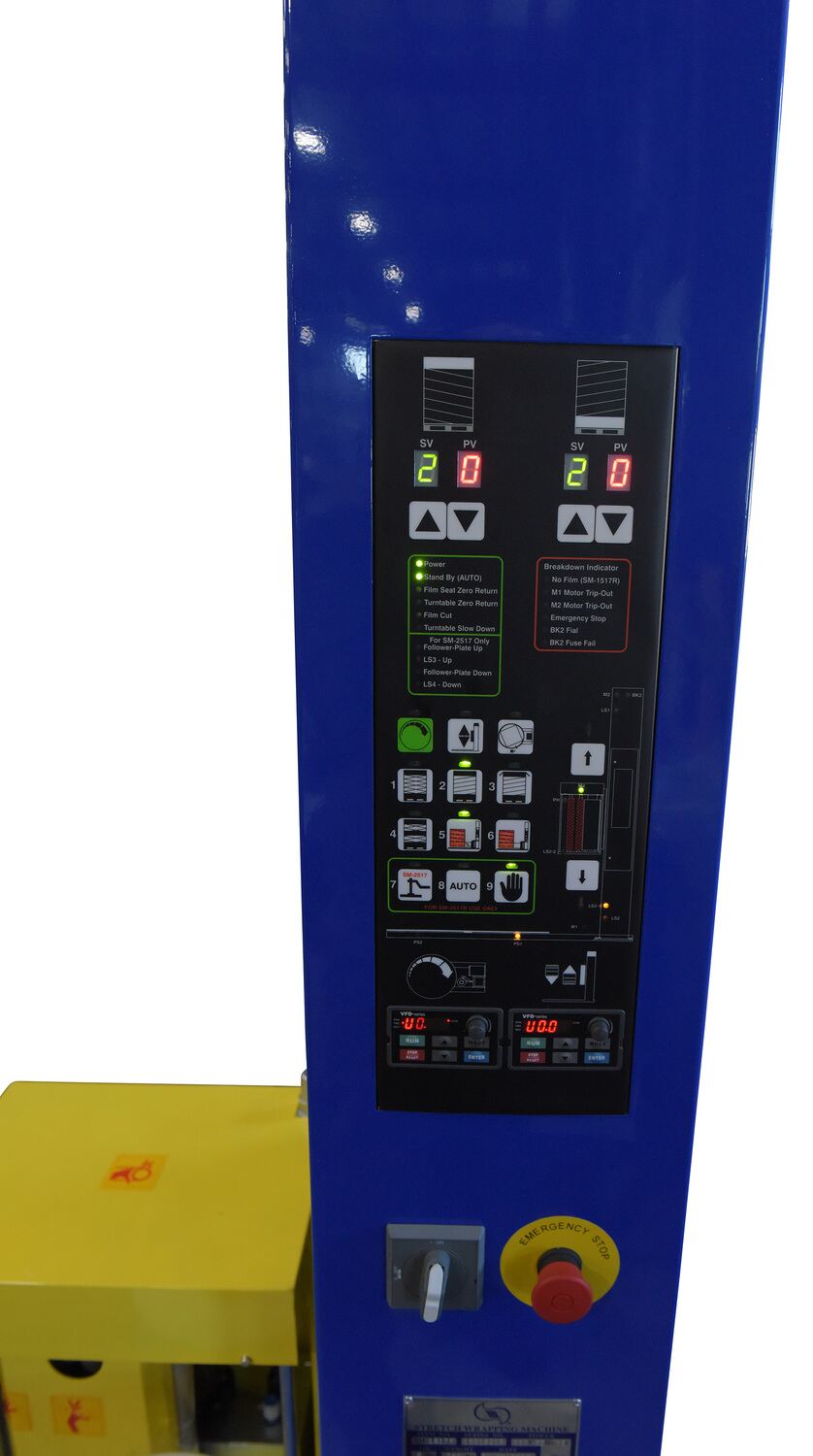 Steel Auto Wrap Stretch Wrap Machine 78-3/4 In. Turntable Diameter 4,000 Lb. Capacity BlueThe Medium Duty high performance auto-wrap stretch wrap machine has a user friendly control center that provides workers with efficient control of the wrapping process. The state of the art digital control circuit allows the operator to set the number of pallet rotations and film wrapping patterns, with four (4) standard multifunction wrapping patterns. The operator simply ties off the film wrap on the carousel and presses the start button. When the unit has completed the wrapping process, the operator can simply cut film or use auto brake feature and remove the wrapped pallet. The powered carousel has variable speeds with a soft start and stop feature. Photocell sensors automatically adjust to different pallet heights.