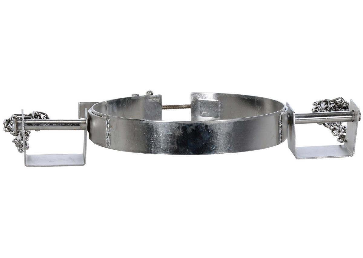 304 Stainless Steel Tilting Drum Ring 30 Gallon Drum 1,200 Lb. Capacity SilverEasily transport steel drums with your fork truck and the tilting drum ring. Pivoting fork pockets allow you to manually rotate drum to dispense light materials. To use, slip the band over the belly of the steel drum and tighten the lock to secure the band around the belly of the drum. Welded steel construction.