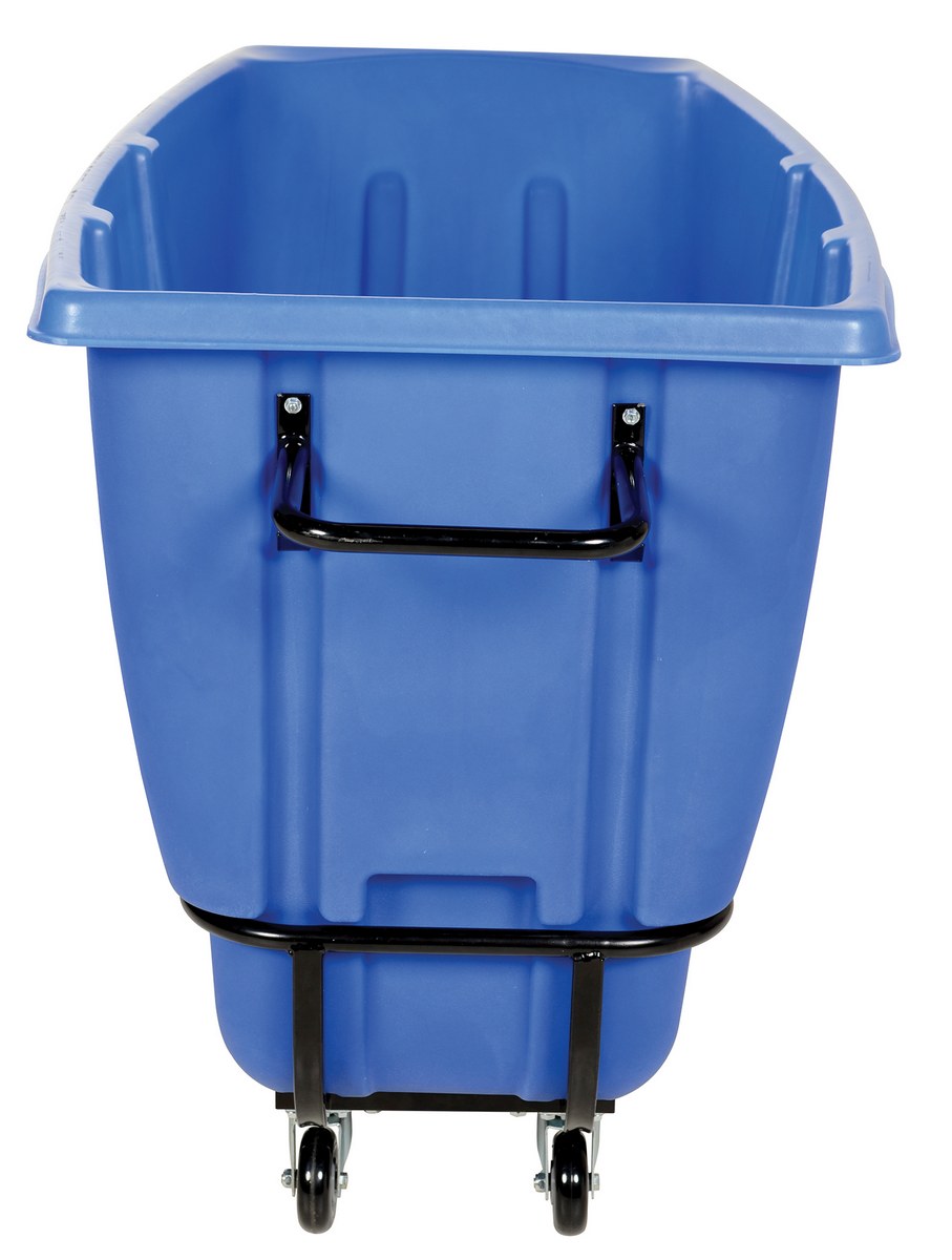 Durable plastic construction allows for collecting waste from multiple bins at a collective time. Great for warehouses, fairs, ball parks, schools, etc. Strong, one-piece molded polyethylene body with steel base tip support and a balanced design to allow for simple dumping by one person. Easily portable on 2 large rubber wheels and two swivel wheels. Not for use with fork trucks. Blue color design.