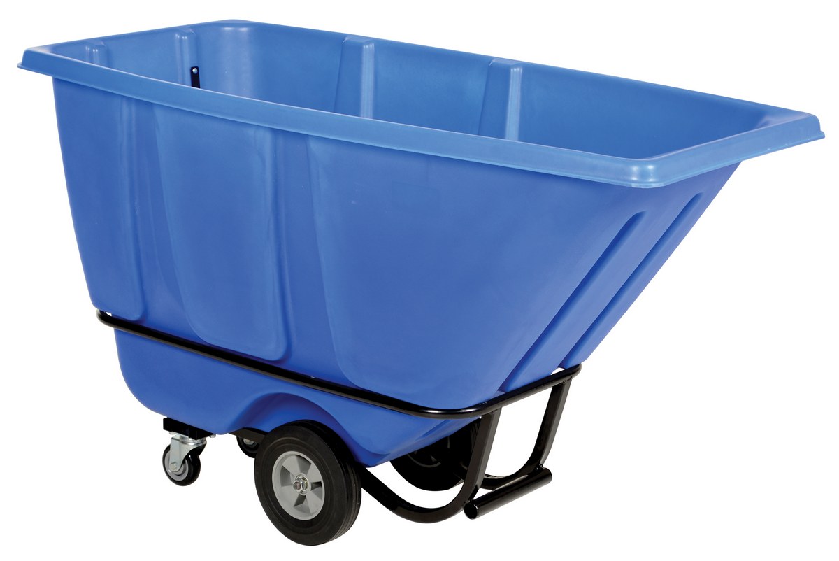 Plastic Heavy Duty Tilt Truck 1/2 Cubic Yard 1400 Lb. Capacity BlueDurable plastic construction allows for collecting waste from multiple bins at a collective time. Great for warehouses, fairs, ball parks, schools, etc. Strong, one-piece molded polyethylene body with steel base tip support and a balanced design to allow for simple dumping by one person. Easily portable on 2 large rubber wheels and two swivel wheels. Not for use with fork trucks. Blue color design.