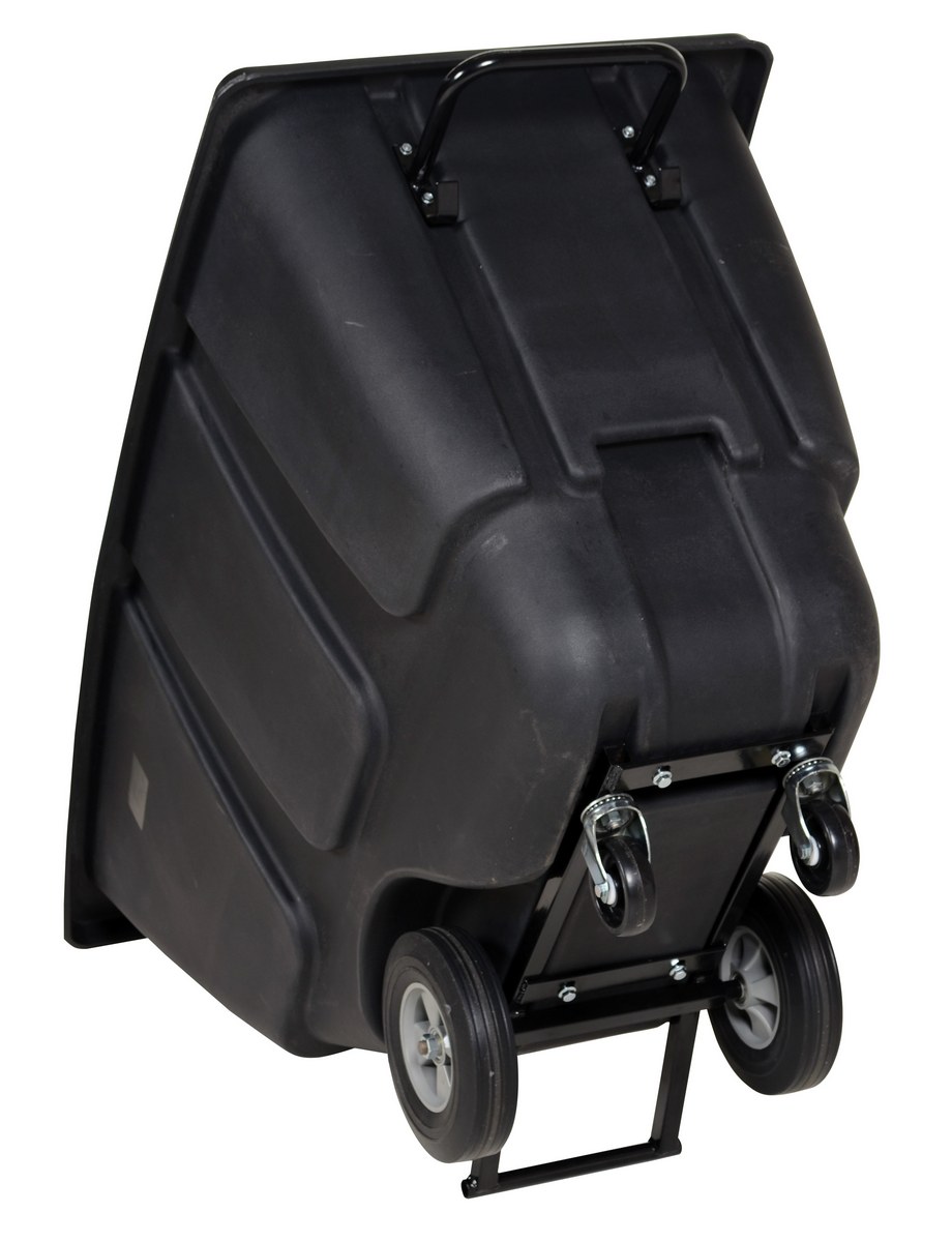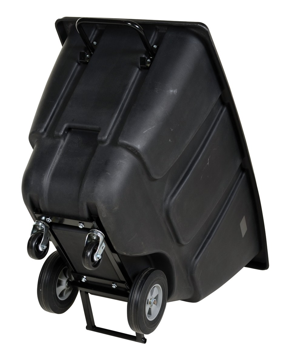 Durable plastic construction allows for collecting waste from multiple bins at a collective time. Great for warehouses, fairs, ball parks, schools, etc. Strong, one-piece molded polyethylene body with steel base tip support and a balanced design to allow for simple dumping by one person. Easily portable on 2 large rubber wheels and two swivel wheels. Not for use with fork trucks. Black color design.