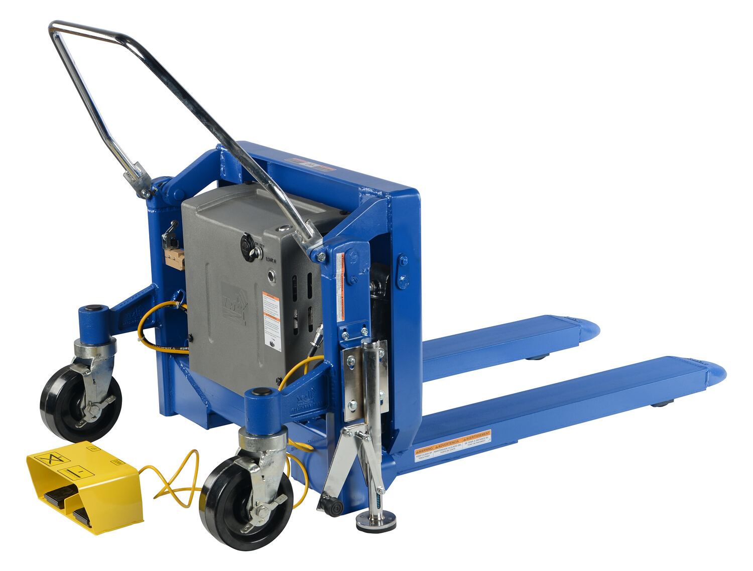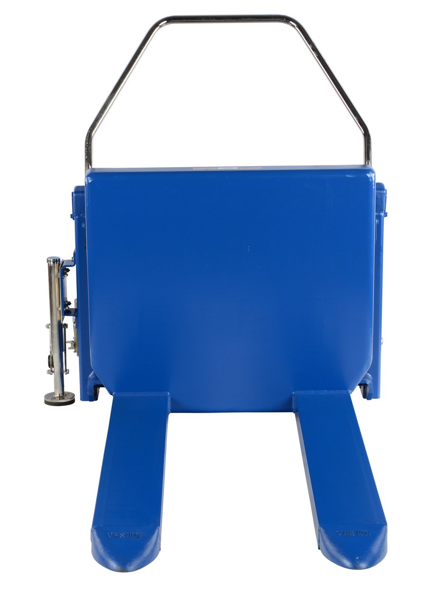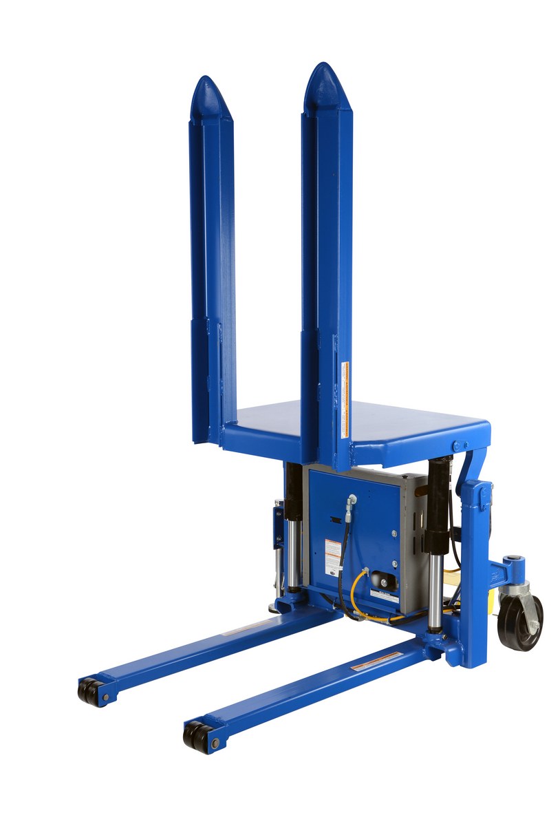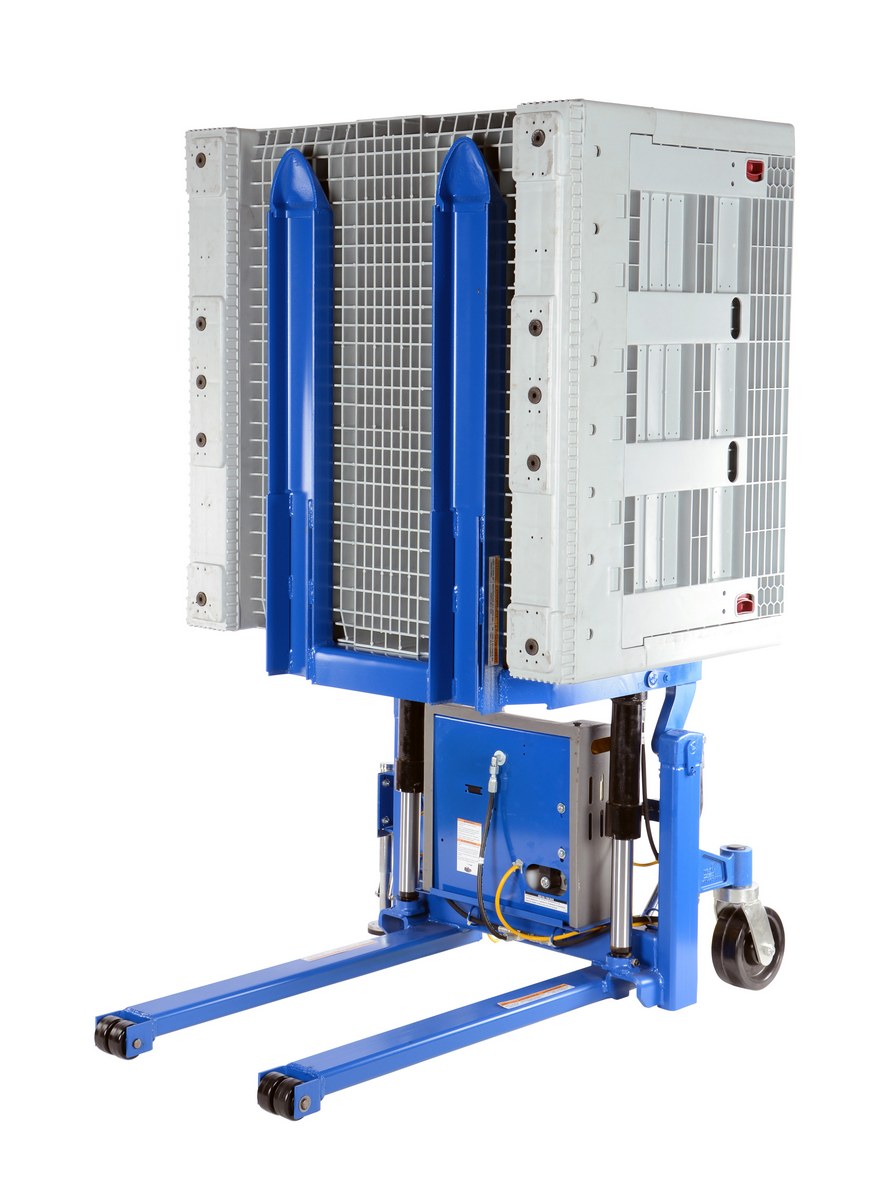 Steel Tilt Master DC Powered Foot Control 12 Volt 2,000 Lb. Capacity BlueThe tilt master lifts and positions filled tote boxes or baskets without the need of a fork truck or lift table using the newly designed heavy-duty tilt master. The tilter will function as transporters by moving completed products from work station to work station without waiting for a fork truck. This lift has a thin profile to allow the user to get as close to the load as possible, has a standard floor lock and rolls easily on the phenolic steering wheels. It is designed to be used with open bottom pallets or skids. The unit is powered by an electric DC motor that includes an on-board battery charger, battery charge indicator gauge and foot control.